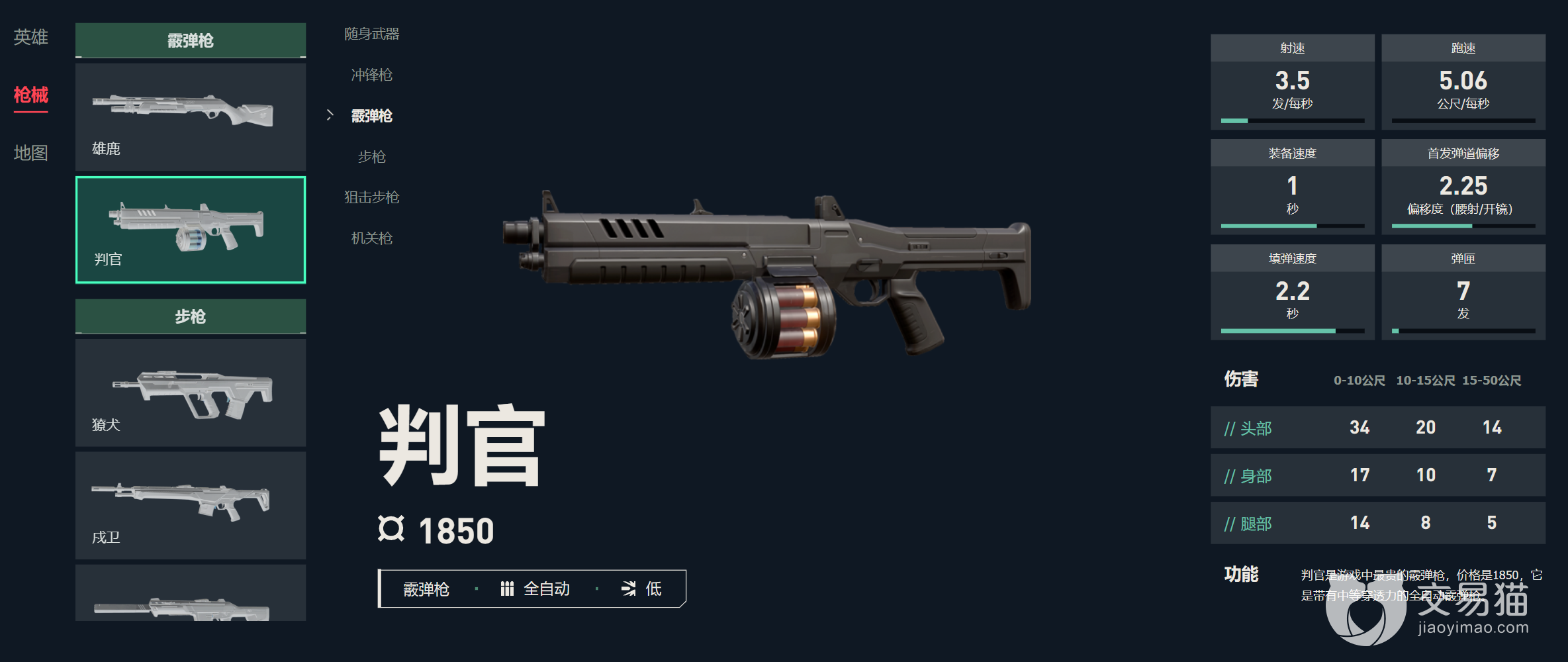 游戏内售价1850,全自动的开枪模式使得其与一般的霰弹枪大有不同,首发弹道偏移不会太高,而且射速也会更快,伤害要比雄鹿命中头部偏低一些,不过弹夹量达到了七发,特别适合分段式预瞄。搭配某些可以干扰敌方视野的特工技能,像睥睨可以在致盲对手之后快速突进到对方脸上给予秒杀,小白玩家和大神玩家同样能够打出更大的优势。