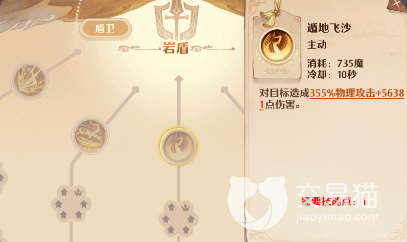 技能三【遁地飞沙】:战士开启此技能需要消耗735点魔力值,同时会对敌人造成355%点物理伤害和56381点固定伤害。冷却时间也是10秒,这个作为主要输出技能来使用,玩家们如果偏向输出方向来培养的话,前期可以优先把这个技能强化度拉满哦!