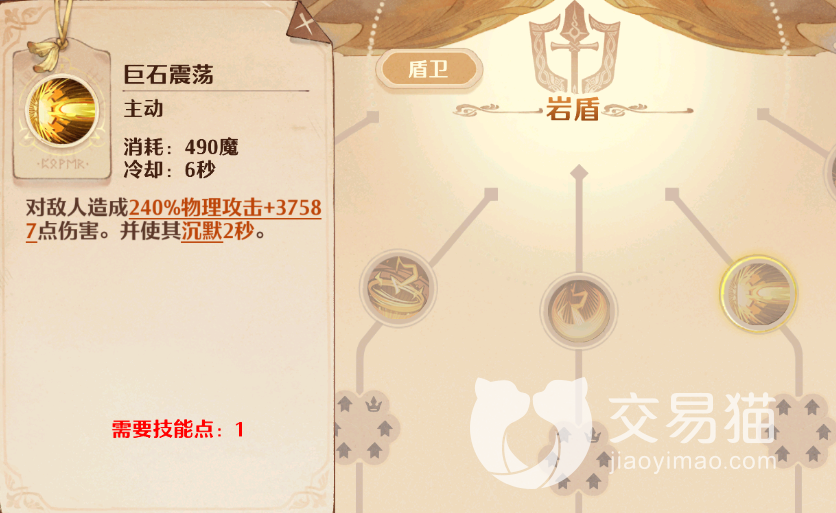 技能四【巨石震荡】:技能开启后会对敌人造成240%的物理伤害,附加37587点固定伤害,而且会让敌人【沉默】2秒,玩家们前期想要控制技能的话优先升级次技能,因为这个技能消耗低,而且冷却时间在五个技能中是最低的,所以优先升级而且收益会比较高。冷却时间是6秒,消耗490点魔力值。