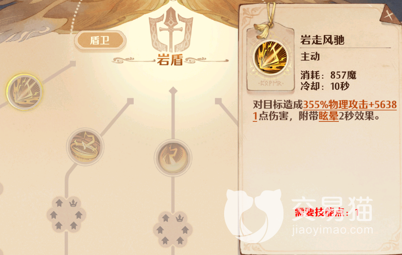 技能一【岩走风驰】:战士开启技能后会对敌人照成355%的物理伤害,并且附加56381点固定伤害,同时附带2秒【眩晕】效果。开启技能需要消耗857点魔力值,冷却时间是10秒,这个技能 小编个人是建议优先选择强化的。