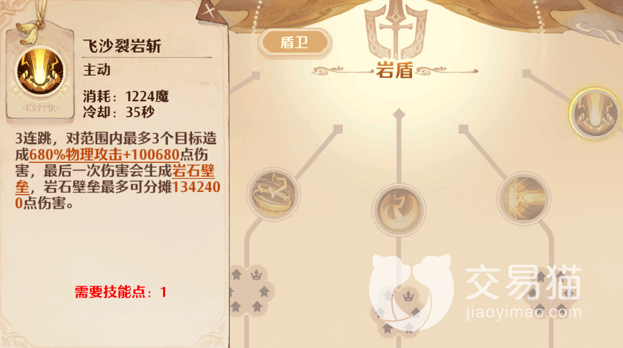 技能五【飞沙裂岩斩】:战士会进行三连跳,然后对范围最多三个目标照成680%的物理伤害,附加100680点固定伤害,同时在最后一次造成伤害的时候,会在敌人附近生成一个【岩石壁垒】,岩石壁垒可以分摊最多1342400点伤害。冷却时间是35秒,需要消耗1224点魔力值。