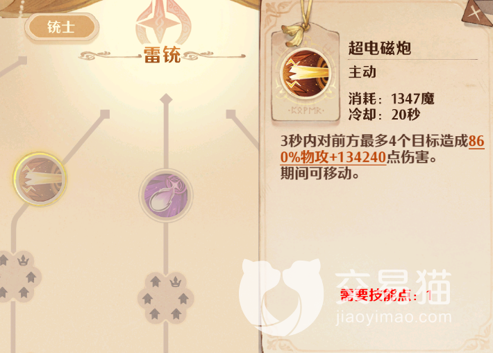 二技能【电击磁炮】:这个开启后会在三秒内对前方最多四个目标造成860%点物理攻击,额外附带134240点伤害吗,同时在释放期间是允许角色进行随意移动的,冷却时间20秒,消耗1347点魔力值。