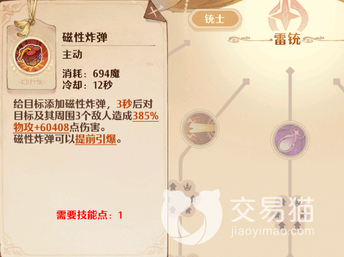 四技能【磁性炸弹】:雷铳开启技能后会给敌人增加磁性炸弹,,在三秒之后对目标以及周围三个敌人造成385%的物理攻击和60408点伤害,磁性炸弹可以提前被引爆,需要消耗694点魔力值,冷却时间是12秒。