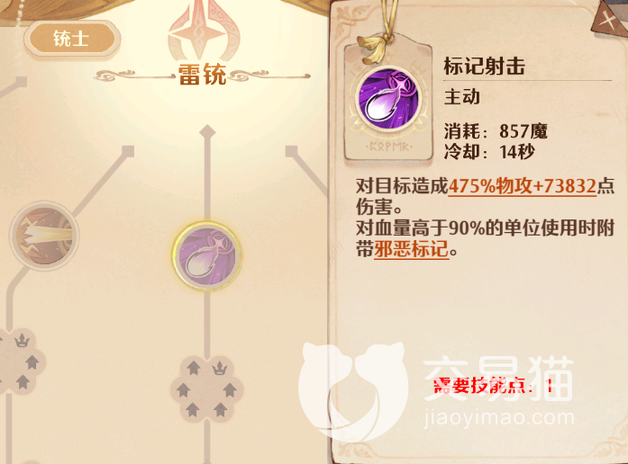三技能【标记射击】:这个技能会对目标进行锁定,然后造成475%物理攻击,额外增加73832点伤害,对血量高于90%的敌人会附加【邪恶标记】,需要消耗857点能量,冷却时间是14秒。