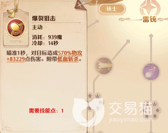 技能五【爆裂狙击】:这个技能需要消耗大量的魔力值,但是伤害目前是最高的,而且在技能的配合方面,还是推荐玩家们优先对这个技能进行升级,而且技能还带有斩杀效果。雷铳在开启技能后会对目标进行瞄准1秒的时间,然后对敌人造成570%点物理攻击和83229点固定伤害,如果角色血量到达一定数值后会进行低血斩杀!