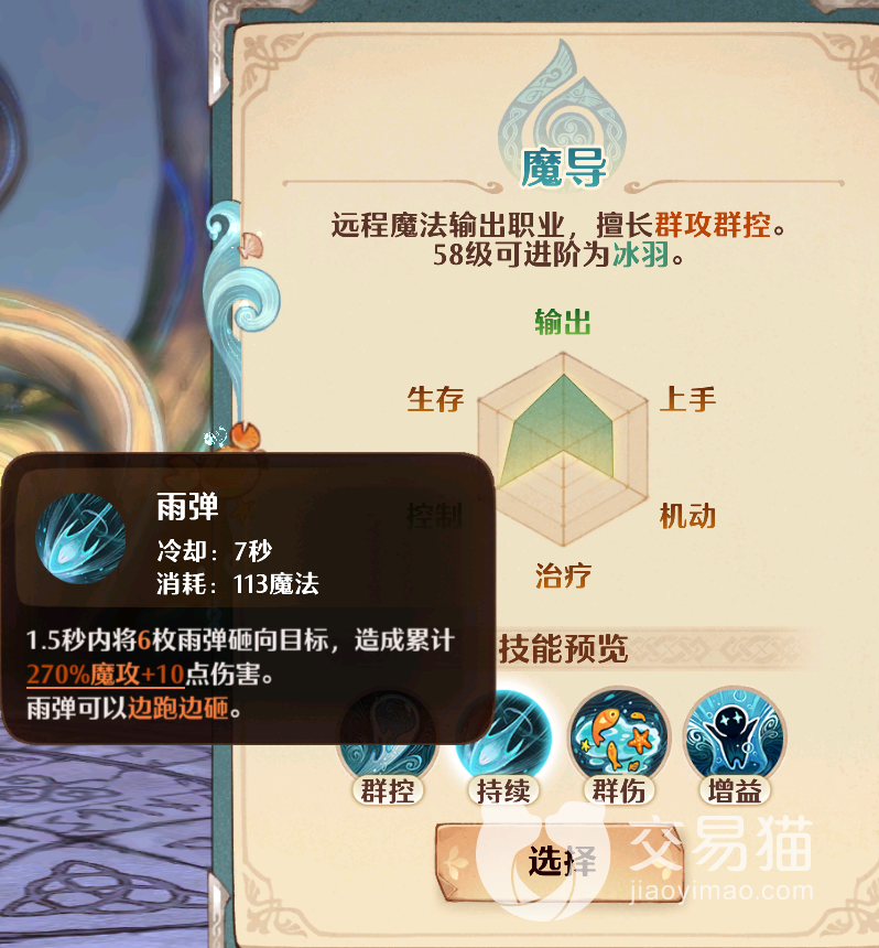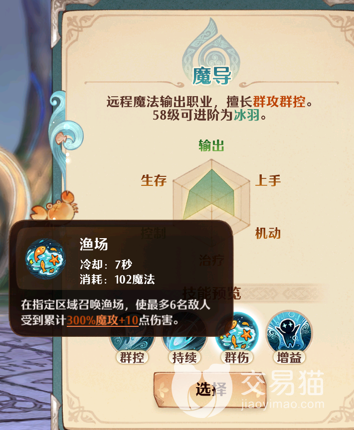 群伤技能【渔场】:魔导是会在指定区域召唤渔场,然后会使最多6名敌人累计收到300%魔法攻击额外附加10点伤害,需要7秒冷却时间并且消耗102点魔法值。