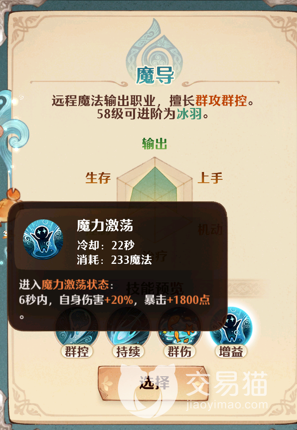增益技能【魔力激荡】:魔导会进入魔力激荡状态,然后在6秒内提升自身20%的伤害,暴击会增加1800点,这个技能是魔导的主要技能了,玩家们可以优先对这个技能进行升级强化,虽然冷却时间需要22秒,但是这个技能可以配合其他三个技能来使用,还是非常不错的,需要消耗233定魔法值。