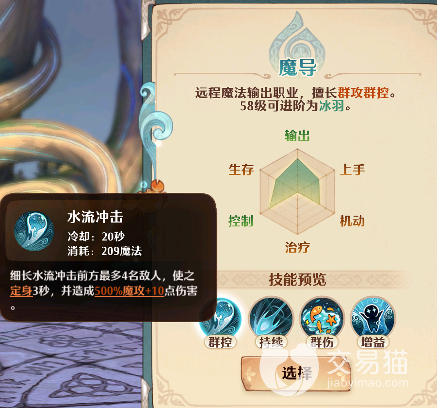 群控技能【水流冲击】:魔导在开启技能后会迸发出细水长流冲击前方最多4名敌人,然后对敌人造成【定身】效果,同时会造成500%的魔法攻击和10点额外伤害,需要消耗209点魔法值与20秒冷却时间,这个技能的冷却时间比较长