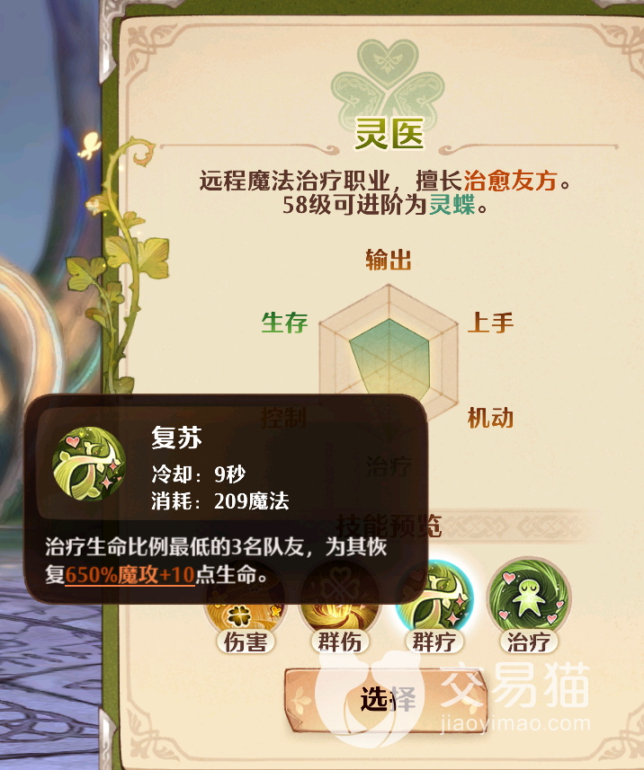 群疗技能【复苏】:这个技能在开启后灵医会治疗附近三名生命值比例最低的队友,为它们回复650%的魔法攻击加额外10点生命值。需要209点魔法值,冷却时间是在9秒,玩家们如果喜欢团队作战的话,在技能点数发放的时候,可以优先强化这个技能。