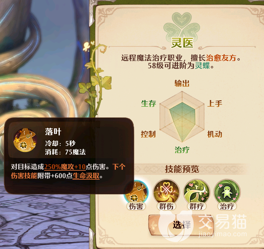 伤害技能【落叶】:这个技能在开启后灵医会对目标发起攻击,造成250%的魔法攻击附加10点伤害,同时会强化下一个技能的属性,会给技能附加600点的生命汲取。这个技能可以让灵医得到很好的续航。这个技能需要5秒冷却,同时消耗75点魔法值。
