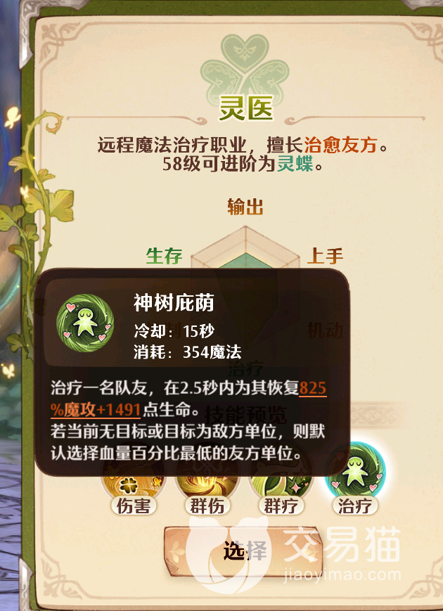 治疗技能【神树庇萌】:灵医开启技能后会治疗一名队友,在2.5秒内为其回复825%的魔攻和额外1491点生命值,同时如果当前没有目标或者使用目标是敌方单位,则会自动默认选择给血量百分比最低的友方为目标单位。这个技能需要15秒冷却时间,而且消耗353点魔法值,不建议玩家们优先进行强化。