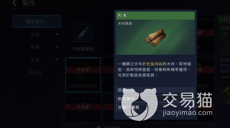 这种材料的要求并不高,因为在游戏初期,可以大规模的采集。木材和岩石都是常见的资源,除了这些之外,我们还可以去杜加河流域砍伐冷杉,那里到处都是冷杉。事实上,在这个世界上,有很多的武器、工具和装备,只要满足一定的要求,就可以通过‘随身制造’来制造。