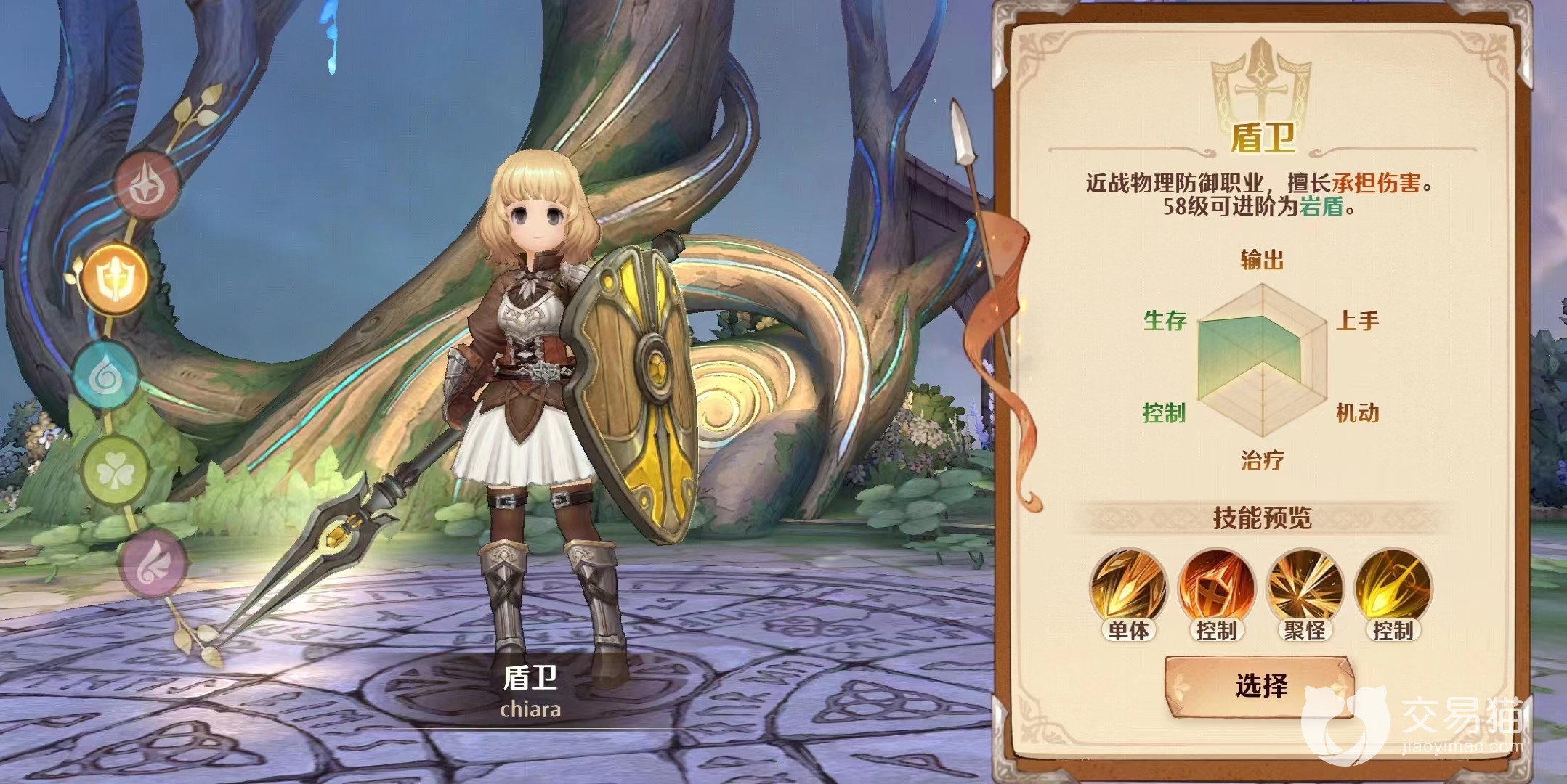 3、盾卫。这个职业的技能主要是在控制和生存上面,也就是说这个职业的血槽会相比于其他职业来说血条长一点,劣势是在输出上稍微有点弱和魔导一样没有治疗技能。