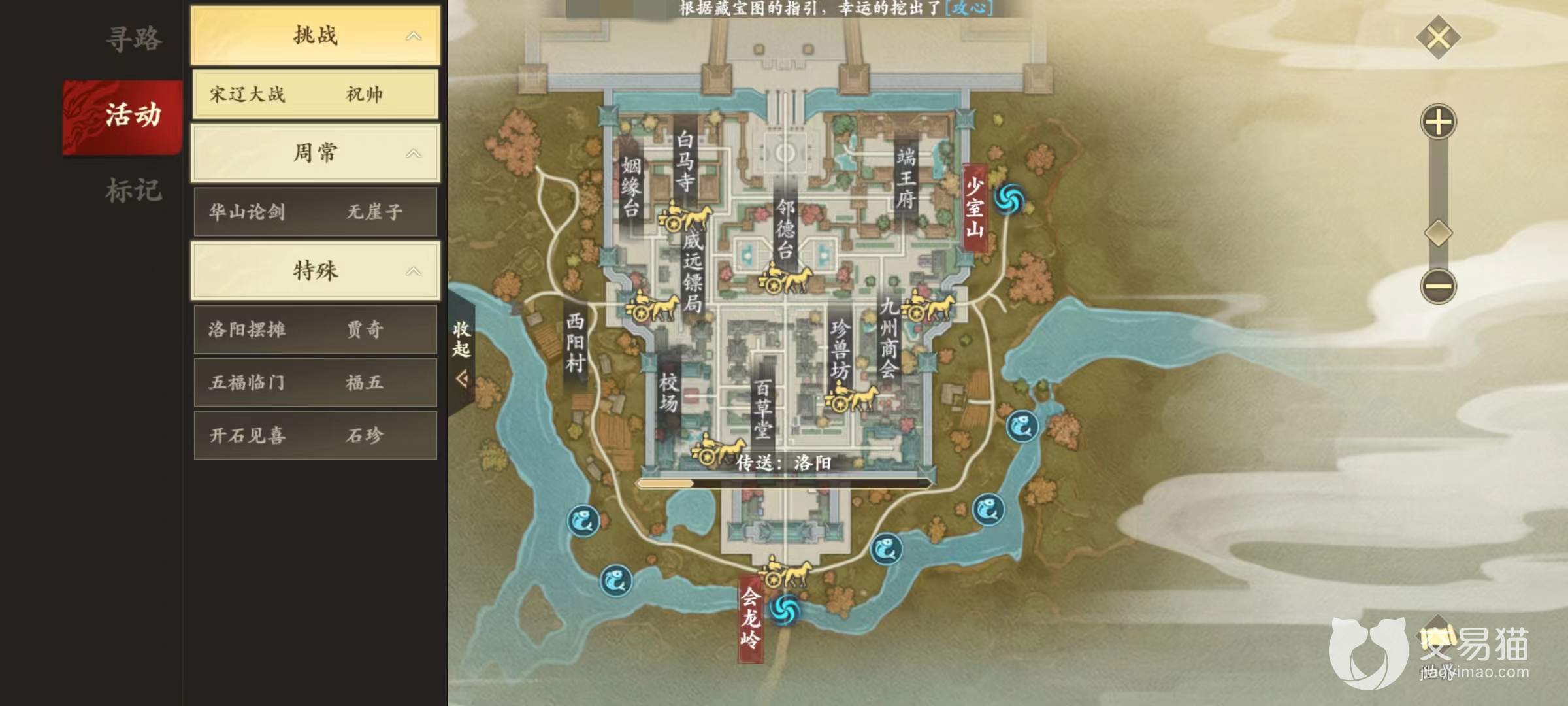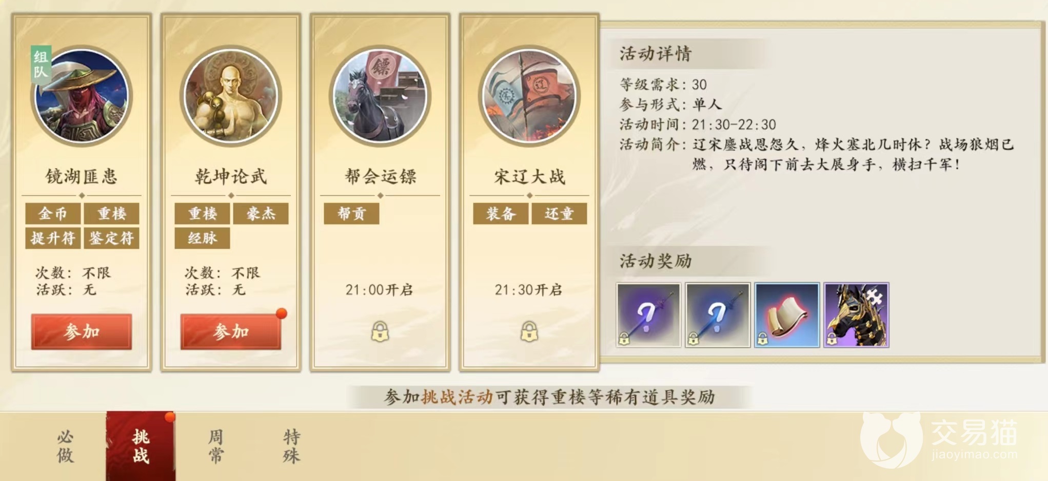 这项挑战玩法在每天晚上9:30~10:30开启,持续一个小时,所有等级达到30级以上玩家都可以单人参与其中。发放任务NPC在洛阳,找到祝帅以后就能看到相关玩法和进入途径。该活动胜负规则就是在规定活动时间内哪方积分较高,哪方阵营就能获胜,如果积分相同则视为平局。