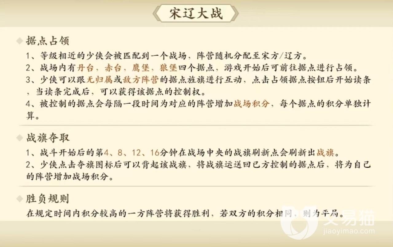 主要内容形式为据点占领和战旗夺取这两个部分,所有等级相近玩家将会被匹配到同一个战场里。阵营则是随机分配,无法自由选择阵营,双方为大宋和大辽。在战场内设有四个据点,需要前往据点后进行占领。当点击读条完成以后,就能获得该据点占领权。只要占领之后,每隔一段时间就会增加一定的战场积分,不同据点积分将采用单独计算方式,当战斗开始到第四、八、十二、十六分钟时,将会在中央出现战旗,双方前往进行战旗的争夺。