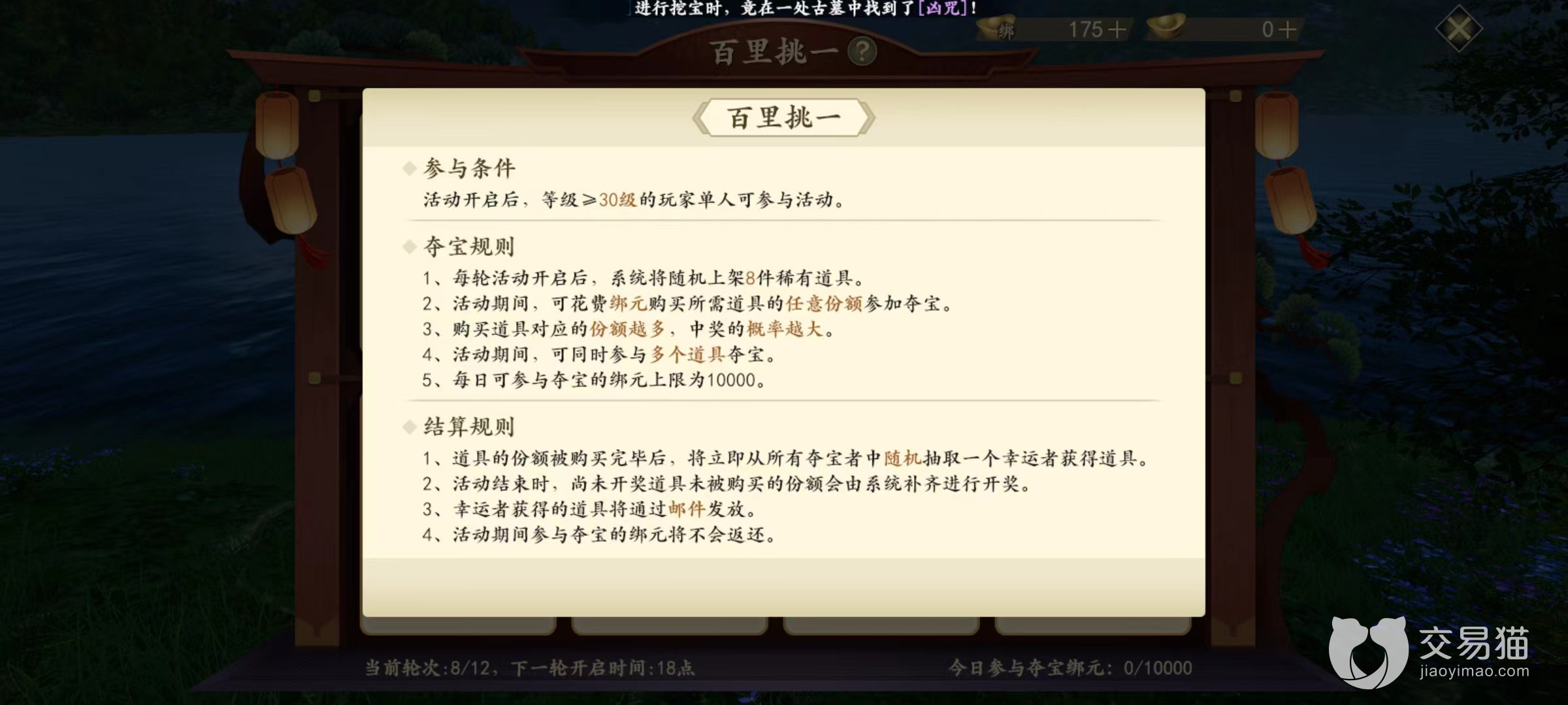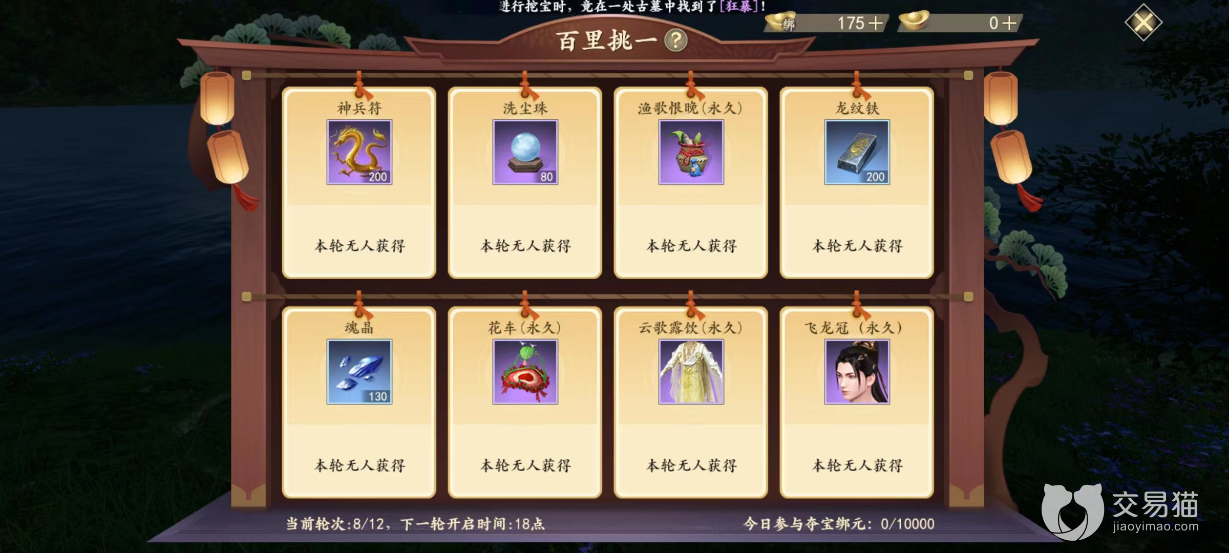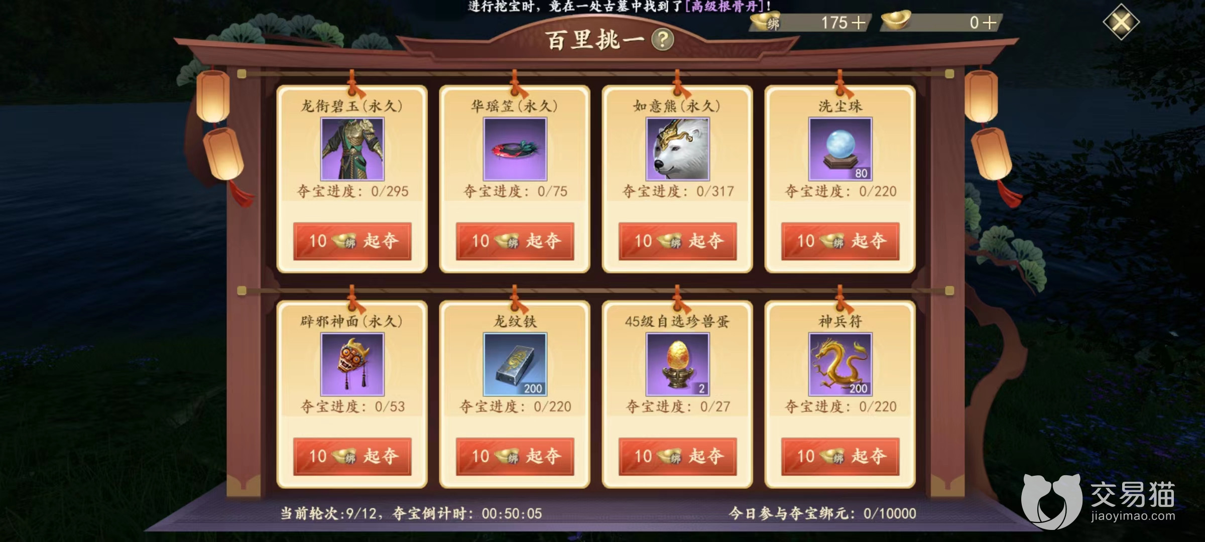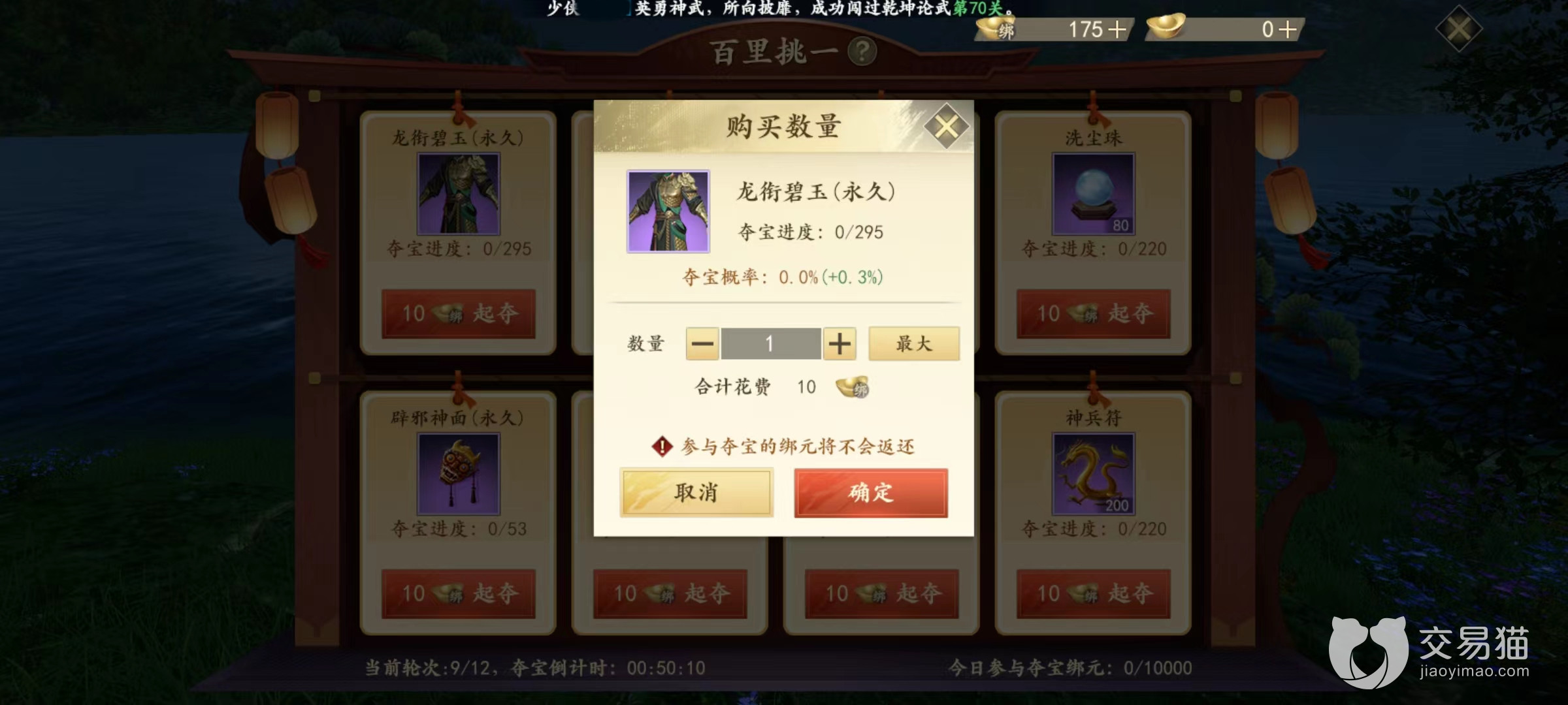 在开启之后可以看到刷新出了8件不同道具,生成时候都是随机选择,而且都是比较稀有类型。每一件下面都有价格,只需要投入十枚绑定元宝就可以开启争夺。但需要注意的是,十枚仅仅是初始价格,可以根据自己需要随意往上加。参加夺宝的绑定元宝上限为1万,在这区间里自由去加价。