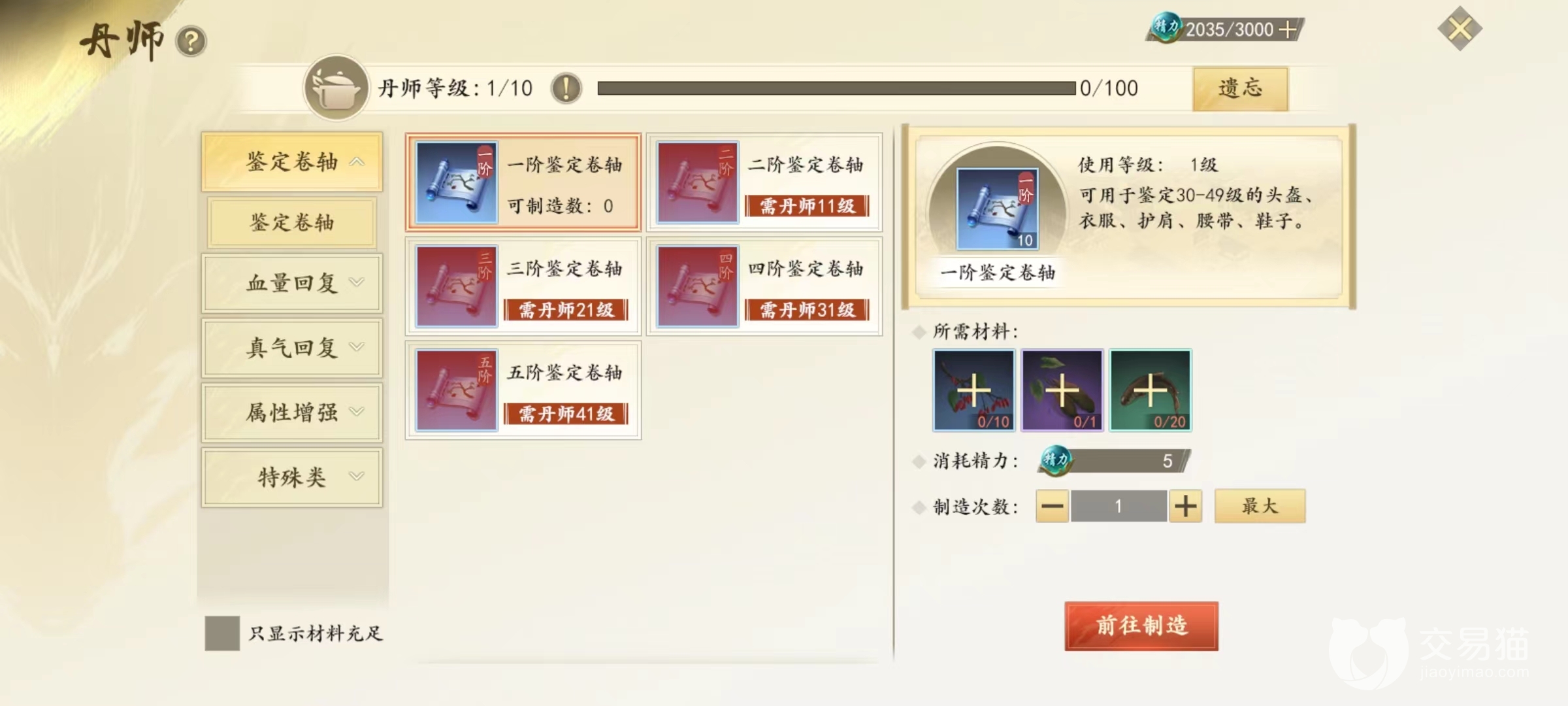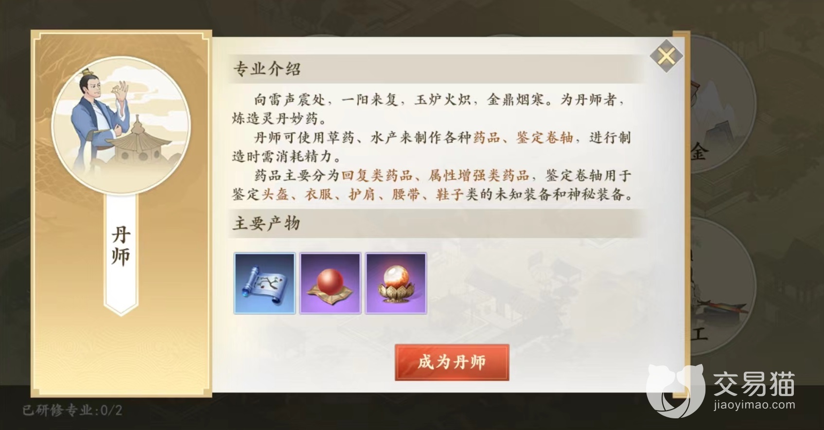 丹师主要消耗各种草药和水产品,来制作出大量药品以及鉴定卷轴等,制造时需要消耗精力,这些产品除了自己使用之外,也能够在交易中出售出去,是现在非常紧俏的货品,能够得到大量金币。主要玩法就是不断去收集材料,然后制作出去赚取差价,选择成为丹师以后可以看到有很多可以制作内容,主要分为鉴定卷轴,血量回复,真气回复,属性增强和特殊类这几大类产品。