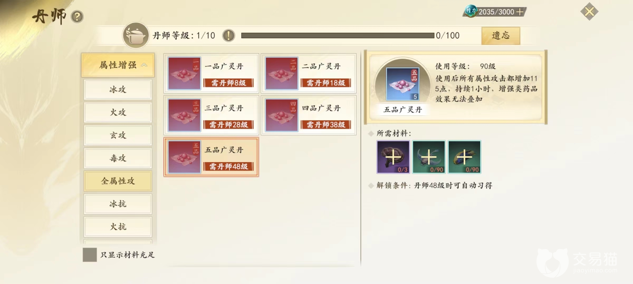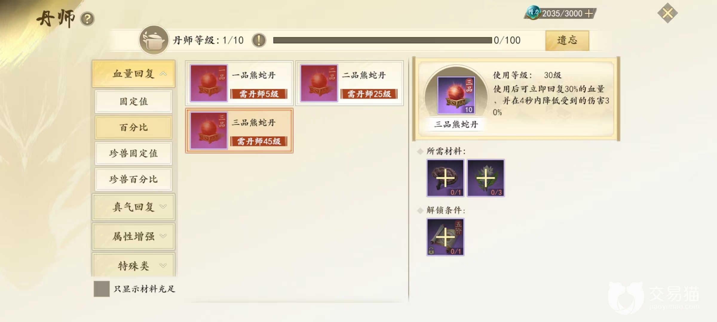 血量恢复和真气回复都是药品类型,其中血量恢复包括固定值、百分比等,除了人物恢复血量还有珍兽药品,也是消耗型道具。所有玩家都有药品需求,包括归元丹、熊蛇丹、回春丹、还神丸等,制作这些丹药主要消耗的就是草药。属性增强类配方更多,有增加冰攻,火攻、玄攻或者是全属性攻等,还有各种抗性以及减抗,这都需要学习相应配方。所以丹师职业是需要长时间累积,这些配方也不是一蹴而就。