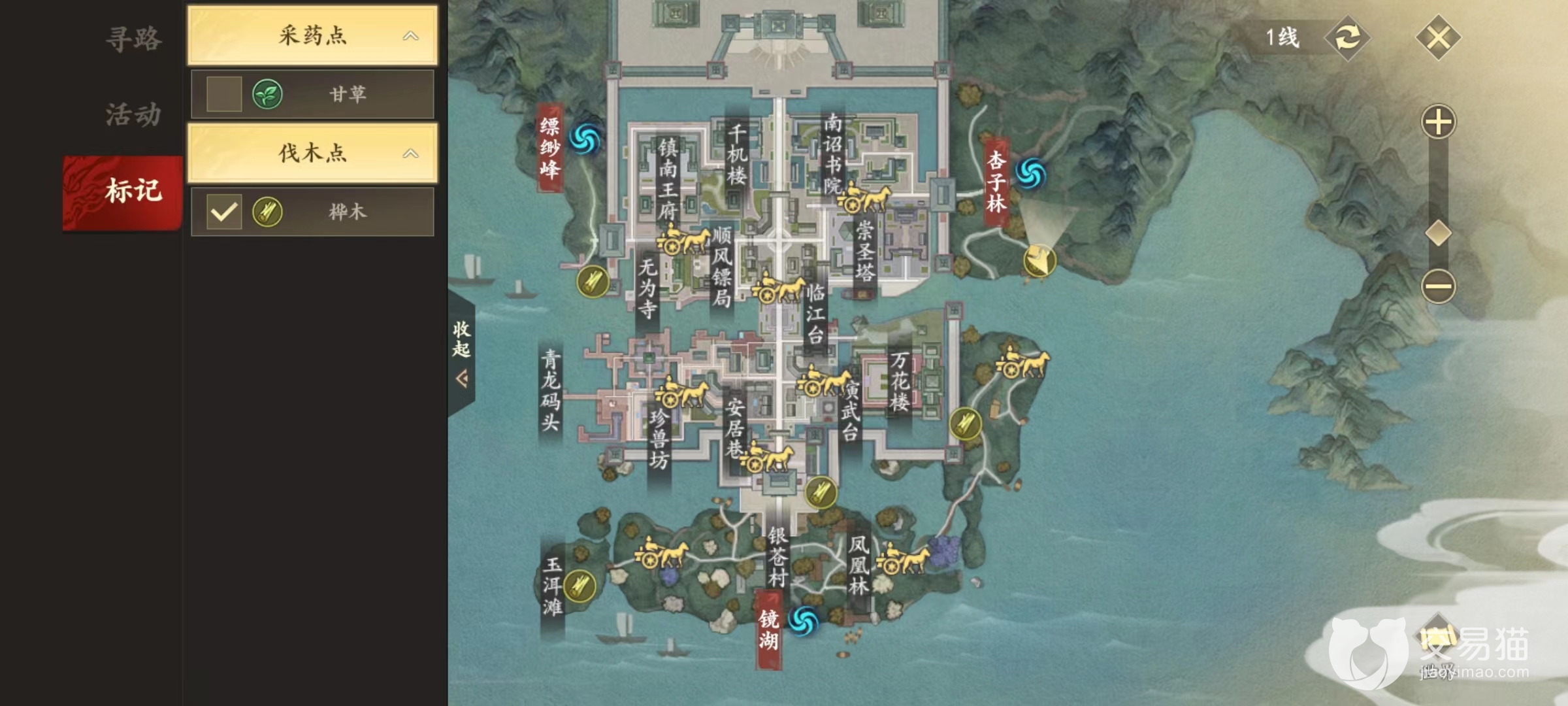 在图谱中选择好自己要采集的资源点击前往,就能自动在地图中将目前所有可采集点显示出来,采用的是圆圈里带有一截木头图标,非常明显。点击可以自动前往,来到地点后可采集点会发出光芒非常显眼,绝对不会找不到。点击采集,只要消耗对应精力就能不断采下去,相比于其他采集职业,采集原木所要消耗的单次时间更长。