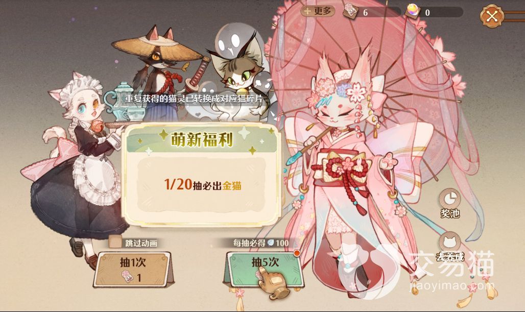当玩家做完简单的新手任务之后,扭蛋功能就会开启,玩家可以在扭蛋中进行猫灵的抽取,最好的猫领品质为金色,而新手福利则是20抽之内必定会获得一只金色猫灵,金色猫灵不仅拥有强大的攻击能力还有可爱的外形服饰。