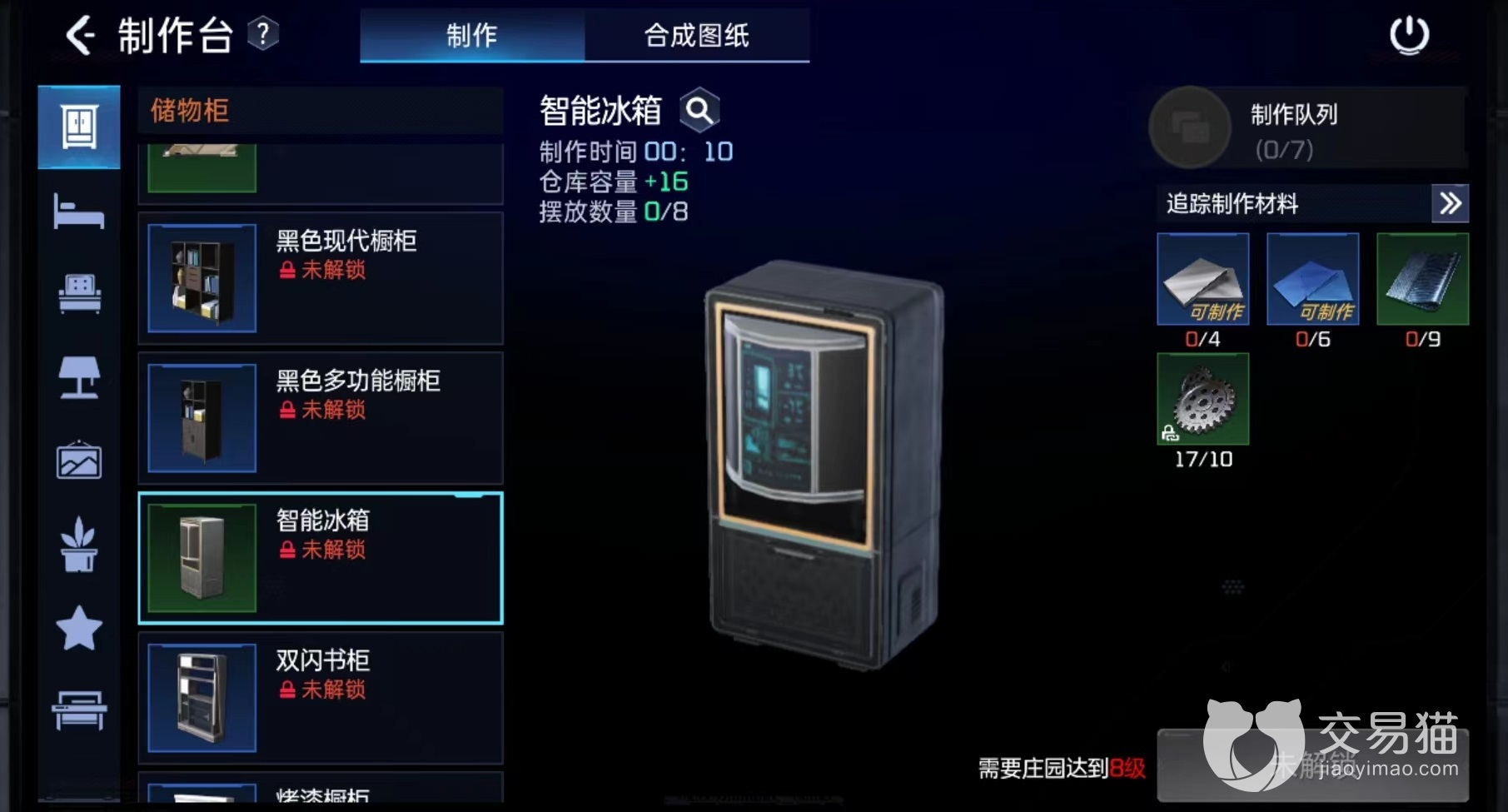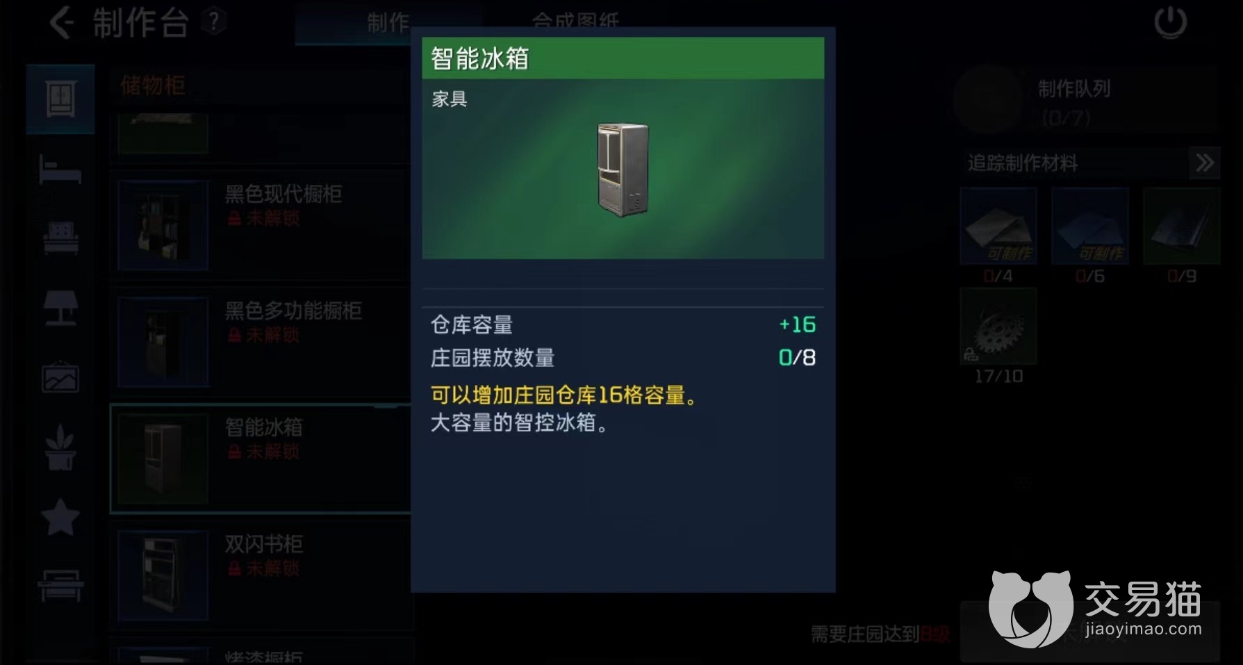 冰箱属于绿色家具,图纸获取起来并不算困难,只要达到庄园八级以后就会自动解锁。作用是摆放以后增加16格仓库容量,很多玩家现在都遇到了仓库空格不够的问题,很多道具无法储存,多放置一些冰箱就能解决,最多能摆放八个。制作时候需要4种原料,分别是陶瓷、塑料、香蕉和机械零件,都能够在大世界中搜集到。