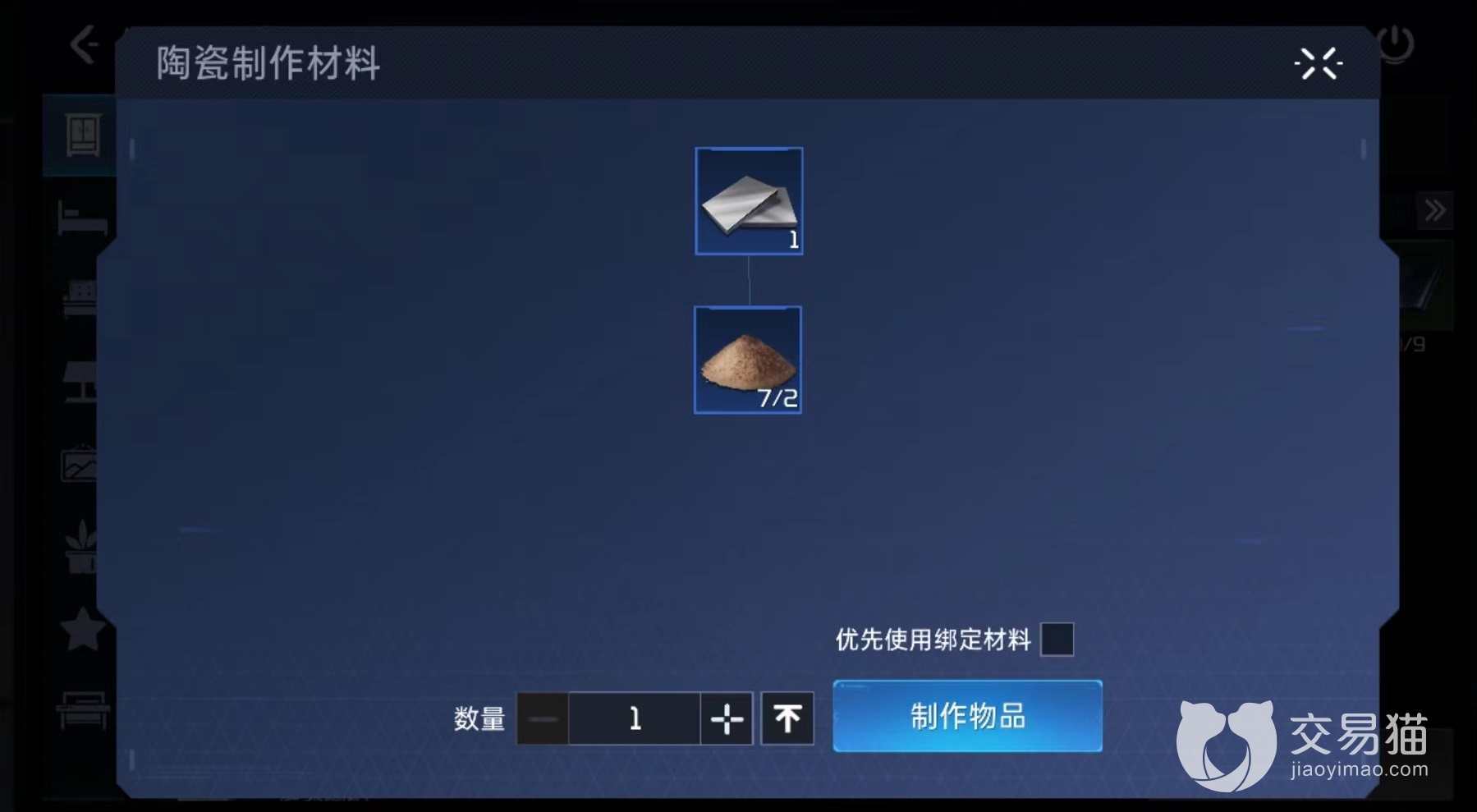 陶瓷属于蓝色半成品,具有耐高温,耐腐蚀特点,获取途径是在庄园装备制造台上冶炼粘土获得,也可以在交易行中购买。粘土通过收集矿石或者是拆解生锈合金轮毂得到。塑料同样是蓝色品质,因为不容易腐烂所以留存下来。在装备制造台上利用树脂合成,两个树脂就可以得到一个塑料。树脂在杜加河谷和尖叫戈壁这样地图中采集树木时有几率获得,也能够拆解木质板材得到。