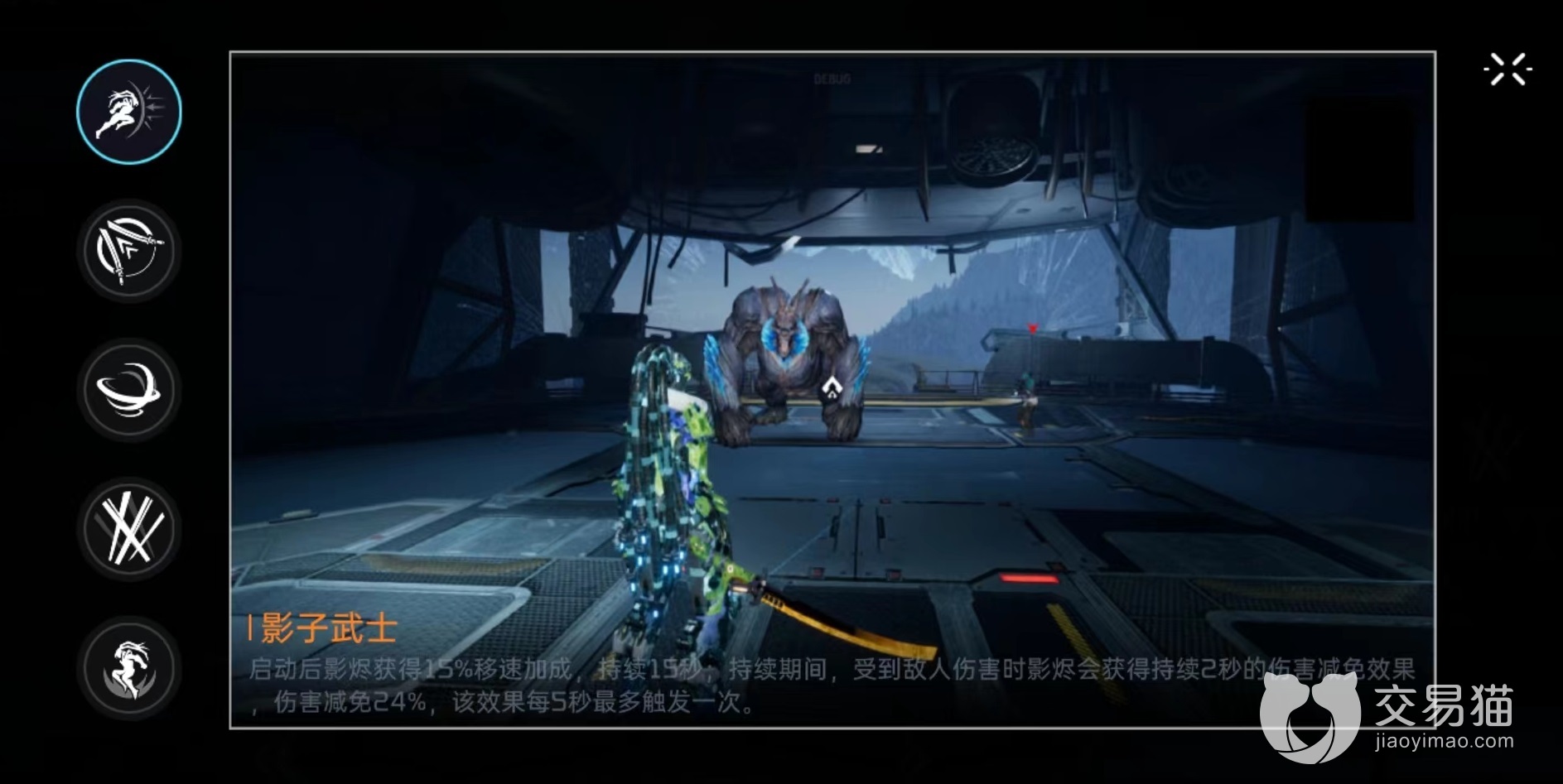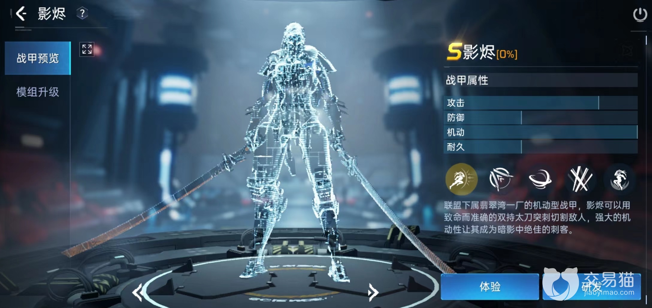 游戏中设计出来的每一名S级战甲角色都有自己专属技能特点,这是其他品质所没有的优势。影烬作为翡翠湾一场的机动型战甲,装备两把致命而准确的太刀,可以高速突击切割敌人,拥有极其强大机动性,所以又被称为刺客。特殊技能影子武士。启动之后获得长达15秒钟的移动速度加成,在持续期间内受到伤害后,将会获得减免效果。攻击怪物时自身将会恢复生命值,所以即使在激烈战斗中依然可以保证自身血量健康。