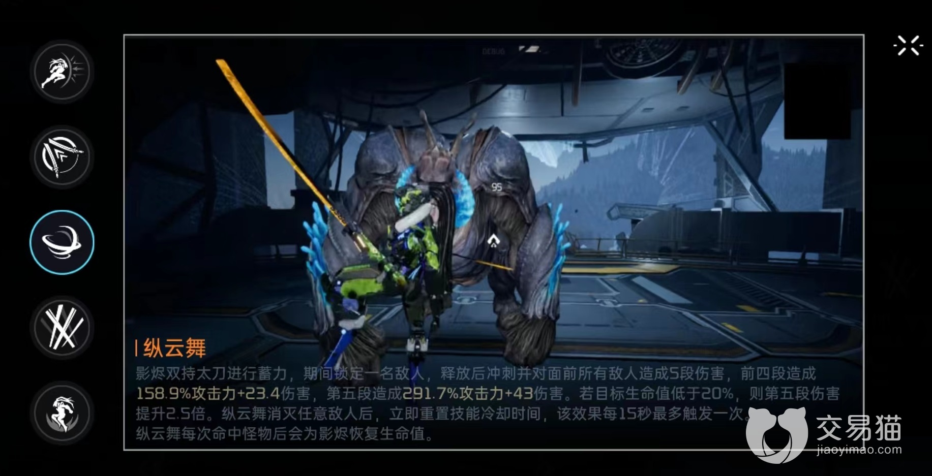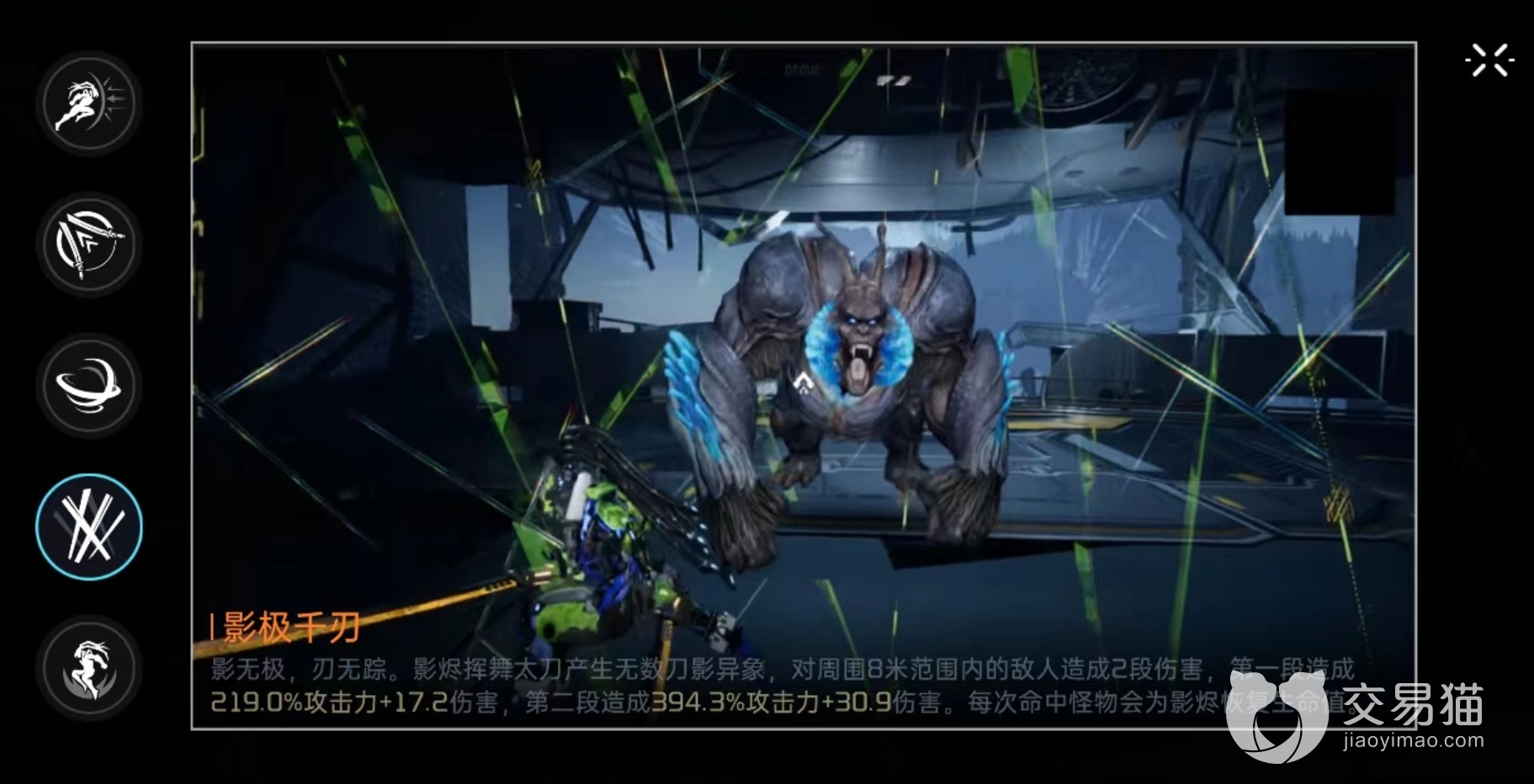 三技能影极千刃,挥舞太刀产生很多刀影异像,对附近8米内所有敌人造成伤害,属于很出色的群攻型技能,用于清理小怪,命中之后同样可以恢复生命值,两段伤害在数值上并不相等,第二段要更高一些。最后一个灵跃,开启推进器进行第二次跳跃,凭借此次跳跃能自由选择方向增加机动性。