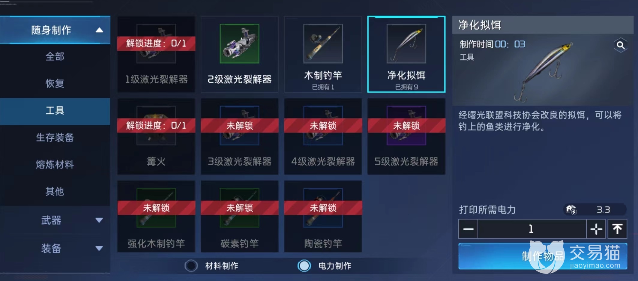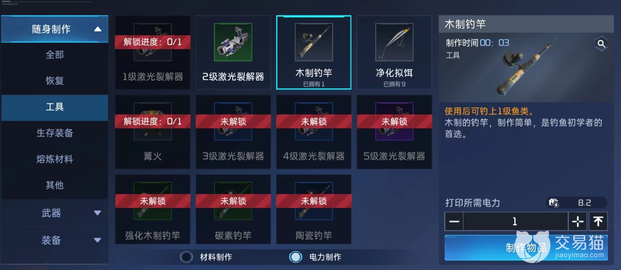 要想钓鱼当然少不了鱼竿和鱼饵,最初大家可以制作的是比较初级的一级鱼竿和普通净化鱼饵,这两种组合就已经能够钓起一级鱼类。但是要想钓到更高级,还需要制作更好的竿,如果竿等级不够,一些稀有种类是不能上钩的,接下来更高级的还有强化木质钓竿,碳素钓杆,陶瓷钓竿等。需要钓鱼等级达到较高水平才能解锁制作。