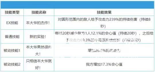 那么她在游戏内的表现又怎么样呢?她的技能详情如何呢?下面就由小编来为大家一一介绍。她的大招即EX技能,具体表现效果为对身前一大片呈扇形区域内造成为239%攻击力的AOE伤害,这一伤害来源十分稳定且有效,在玩家用来推图时有奇效,是不可或缺的存在。