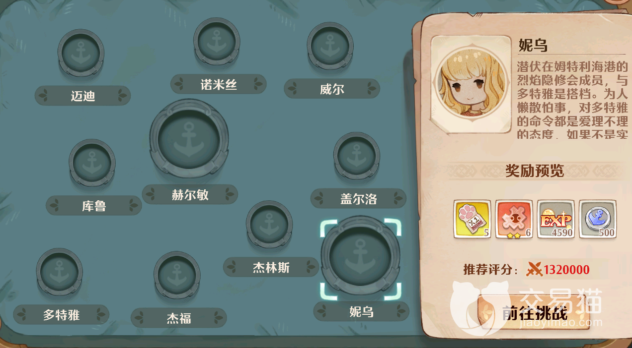 第五个区域“姆特利海港”,这里的大boss妮乌有1320000的战力,需要玩家将装备,猫灵,幻果以及卡牌的品质和练度都拉满才有一战之力。
