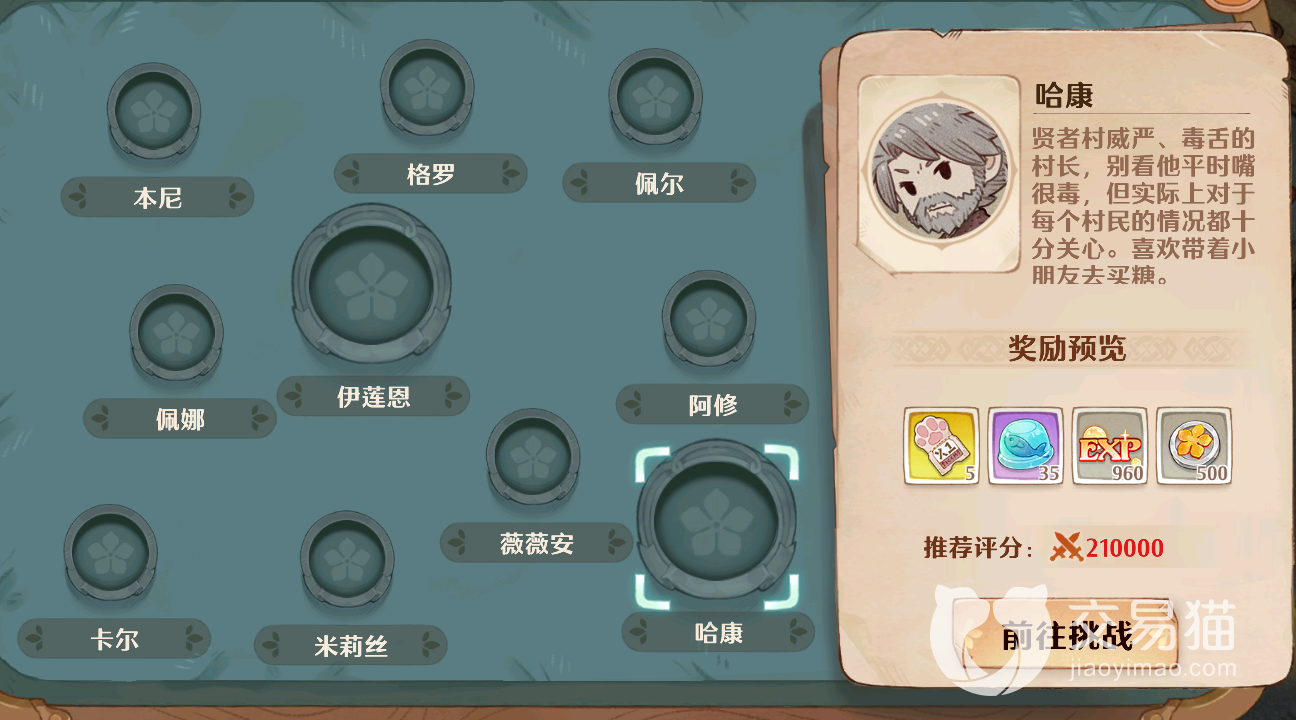 第二个区域是“贤者森林”,这里的最高战力是哈康,他也是个村长,击败奖励有猫灵扭蛋券,鱼冻,经验值和贤者森林信物,不过要击败他的话,你的战力起码得突破二十一万,这个阶段建议多把培养重心放在主角自己的装备上,以此弥补前期对这边的疏漏。
