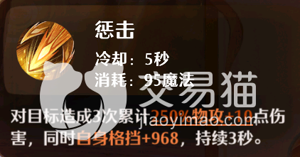 技能:它的四个技能分工十分明确,首先第一个“惩击”是CD五秒的单体伤害技能,会使用手中武器向前进行三次戳刺,从而造成250物攻+10的伤害,并为自身添加持续三秒的968点格挡,这个伤害虽然并不算高,但胜在技能CD短,所以可以频繁施放,并且它的格挡增益也是相对实用的。