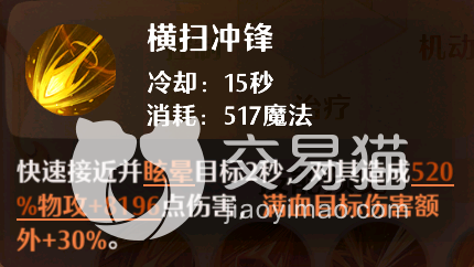 最后的“横扫冲锋”则是15秒CD的突进技能,可以直接冲向一个目标并眩晕它两秒,伤害也是达到了520%物攻+8196的水平,另外它对于满血敌人还会额外造成30%伤害,这个技能既提供了位移手段让盾卫机动性略微提升,又有着稳定的两秒控制,而且还可以对满血敌人产生额外增伤,可谓是对盾卫起到了非常全面的提升。