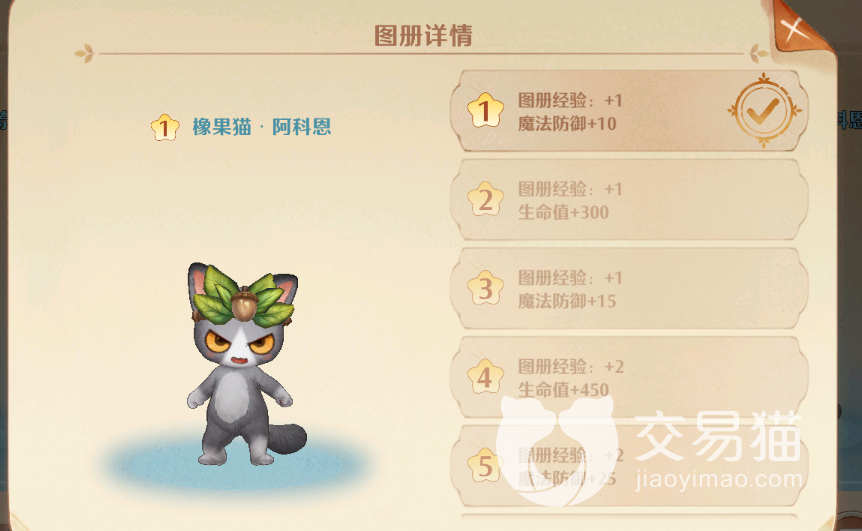 【橡果猫·阿科恩】:这个猫猫是没有技能加成的,推荐这个猫猫的原因是因为这个猫非常适合近战职业或者适合只需要增加基础值的角色,不如说刺客就非常适合这个猫灵作为辅助猫灵来使用,1星可以增加10点魔法防御,2星可以增加自身300点生命值,3星可以增加15点魔法防御值,4星可以增加450点生命值,5星可以增加25点魔法防御,6星可以增加750点生命值,同时给图册经验增加3点,这个猫猫的基础加成是可以叠加的。