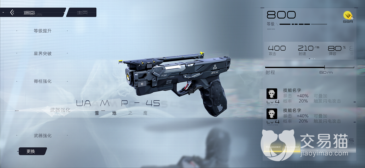 首先给大家介绍的武器类型是手枪,这里为大家着重介绍两把手枪,一把是P5T星辰大海,另一把是烂橘子。先说星辰大海这把枪,它的攻击力特别高,面板攻击数值也高达510,其中特别令人瞩目的是它的弱点伤害加成,达到了5%十,暴击率也不错,初始暴击伤害有12%。这把枪的武器技能也是可圈可点,动能技能可以直接提升武器伤害,对敌人造成更多伤害,此外,还能在命中敌人后增加子弹数量,降低玩家换弹频率。