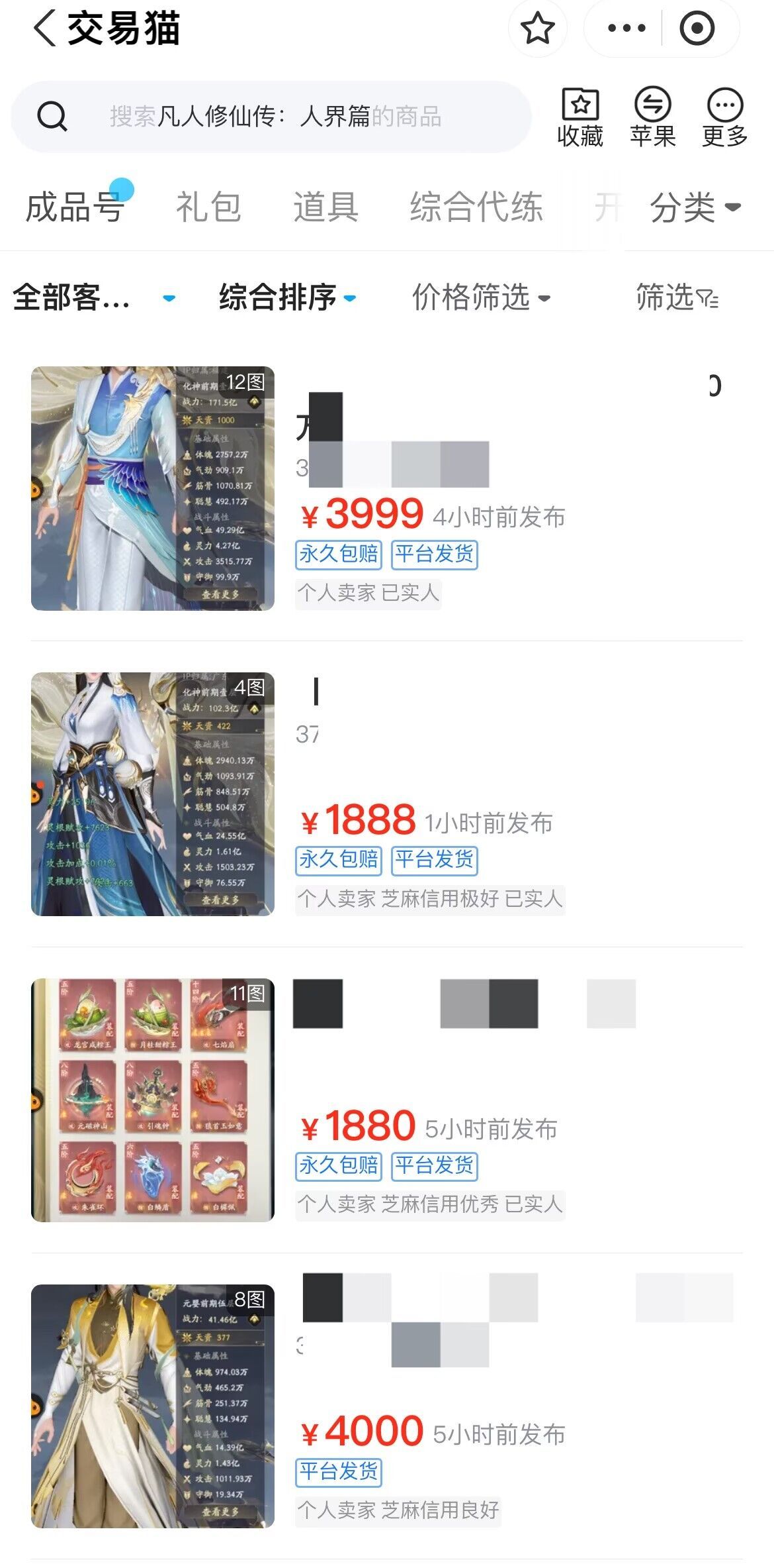 上述凡人修仙传人界篇账号交易平台推荐全部介绍了,关于游戏的交易需求你都可以来交易猫这里,没时间上分你可以选择代练业务,限定的道具装备你没有领取到,来到这里搜关键字就可以找到,低廉的价格能帮你淘到性价比超高的商品,多么开心的事情。