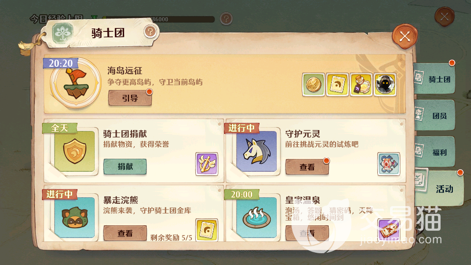 玩家们可以在骑士团领地找到骑士团活动板块,也可以直接点击右上角的活动界面,可以直接看到骑士团活动。点击进入参与即可。骑士团活动大体分为五种,海岛远征是属于限时活动,会在特定的时间开放。而骑士团捐献,守护元灵,暴走浣熊以及皇家温泉,这些都是每天都会开放的。除了皇家温泉之外,其他几个玩家们随时随地都可以参与。皇家温泉只能在晚上十点才能解锁,玩家们通过泡汤,答题,猜密码以及各种小活动来赢取更多物资奖励。骑士团捐献可以帮助玩家们获取荣誉物资,荣誉物资可以兑换更多骑士团资源。