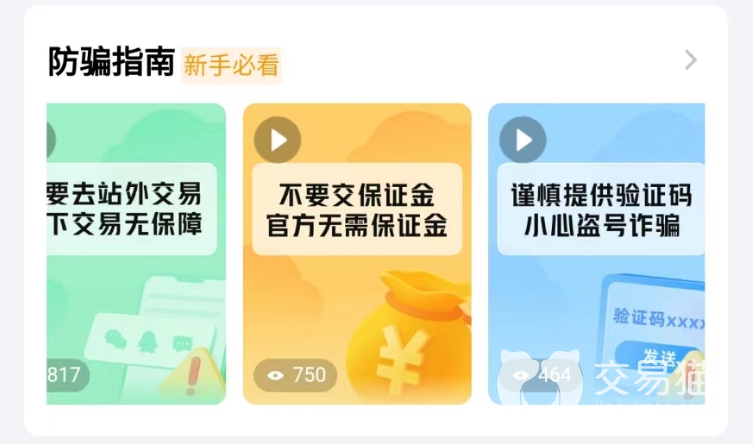 很多小伙伴刚接触交易猫还不知道怎么买卖账号,可以先进入安全中心学习平台规则和一些交易需要注意的事项。里面还有详细的防骗指南以及新手必看的常见问题,在交易的时候觉得不对劲或者遇到了骗子,也能在安全中心这里举报,平台和用户一起维护好平台环境,打击骗号骗钱的行为。