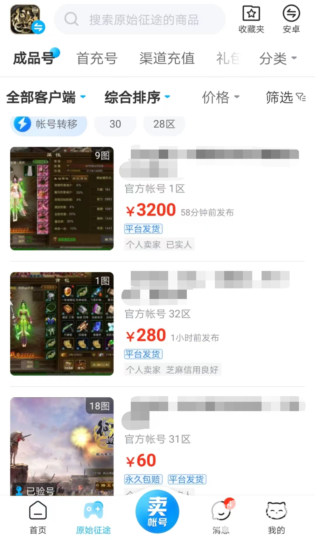 平台里的游戏账号特别丰富,就拿原始征途来说,不仅有来自各个服务器的成品号,还能买到起始资源多性价比高的首充号,关于礼包、道具,甚至想要给游戏充值这些都有。不仅系统给大家推荐好的账号,用户自己也能勾选条件更快锁定想要的商品。