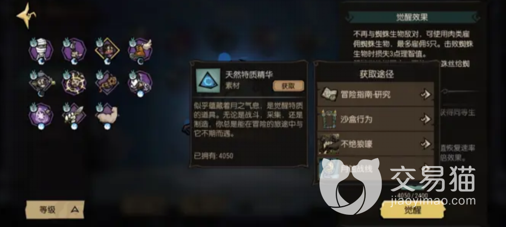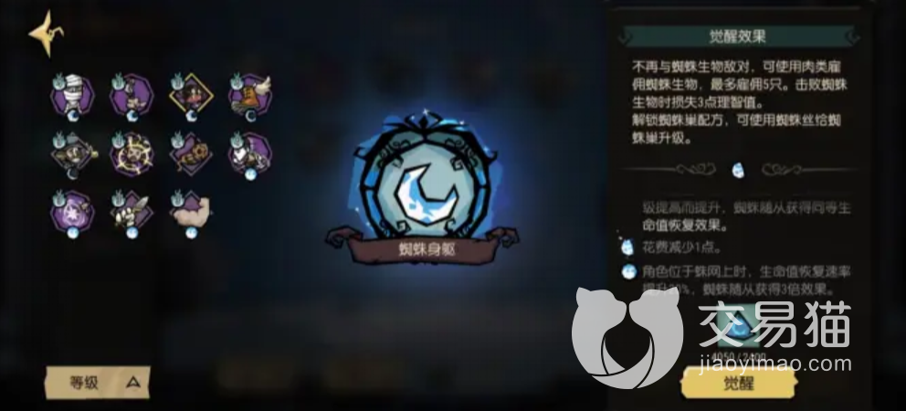 比如这个蜘蛛之躯的技能,平平无奇,但是选定这个觉醒的界面之后消耗蓝色的三角之后就能获得上面显示的技能让玩家能够雇佣蜘蛛,让该特质的角色获取更多的攻击方法,甚至能改变了这个角色的相应玩法。