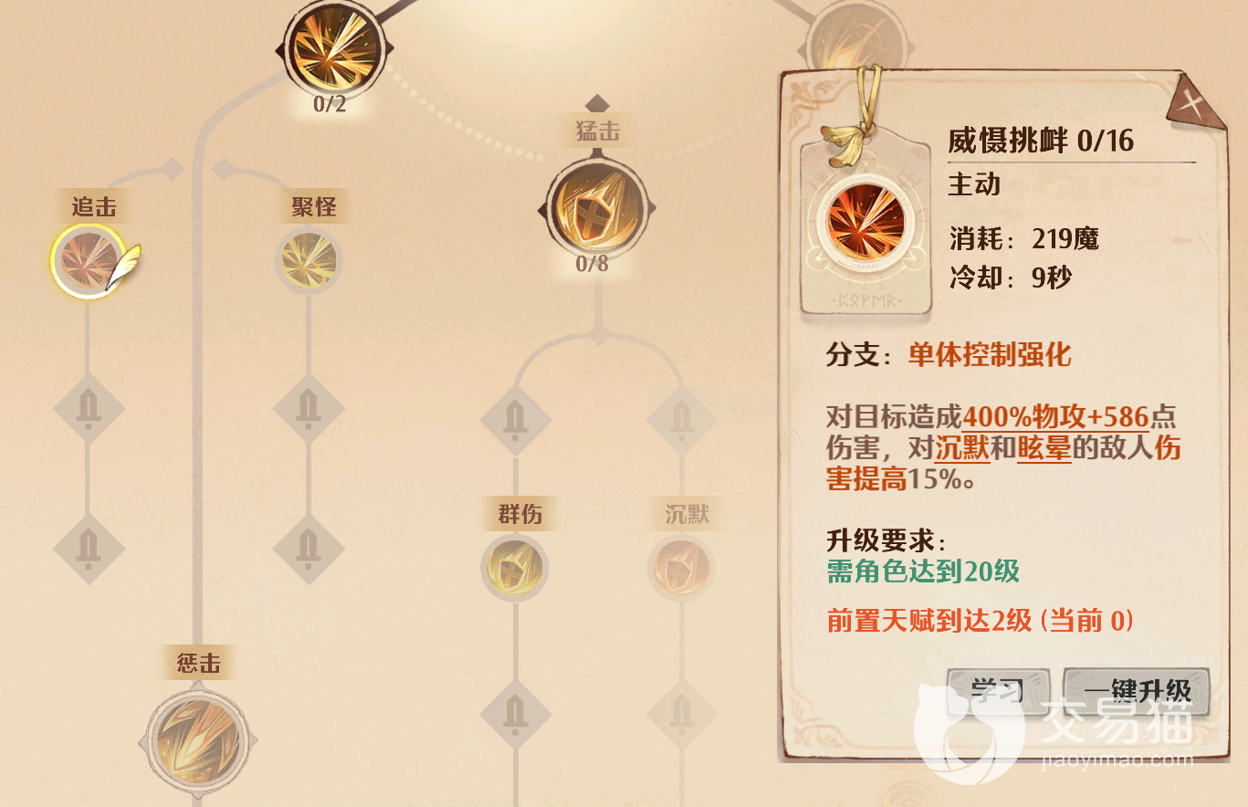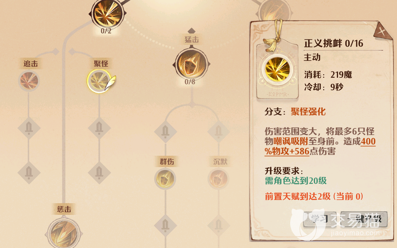 挑衅点满之后,它下面会出现两个分支,一个是正义挑衅,一个是威慑挑衅,二者只能选其一,这里建议还是选正义挑衅更好,因为威慑挑衅的作用需要到后面开了其他两条技能树里的沉默和眩晕才能体现。而正义挑衅则可以通过扩大聚怪范围和增加伤害这两项效果,直接为战士带来前期的即战力提升。
