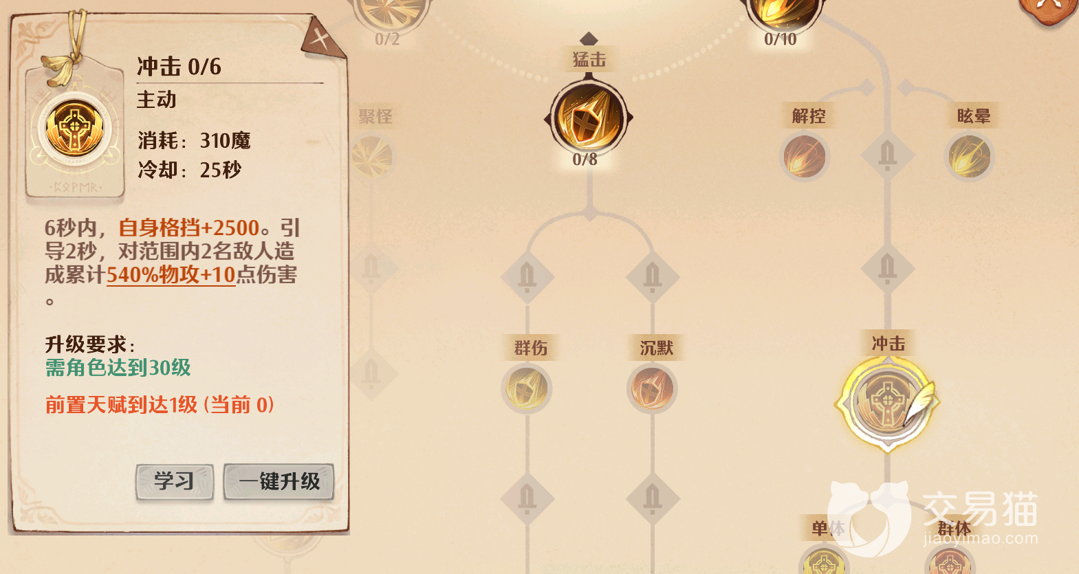 接着可以把“狂怒冲锋”和“冲击”之间的耐力和物理防御属性也给点出来,一共只需花费三个技能点,成本并不算高,却能够提供可观的防御数值保障,你的战士坦度因此更进一步,而且点出它们本身也是“冲击”解锁的必备条件之一。“冲击”这一技能总共六级,它本身对于战士的提升非常巨大,使用后可以直接获得6秒的2500点格挡,同时还能在这过程中通过2秒引导来对周围敌人造成540%物攻+10的伤害,既帮助队伍吸收了成吨伤害,又没有耽搁自己的输出。