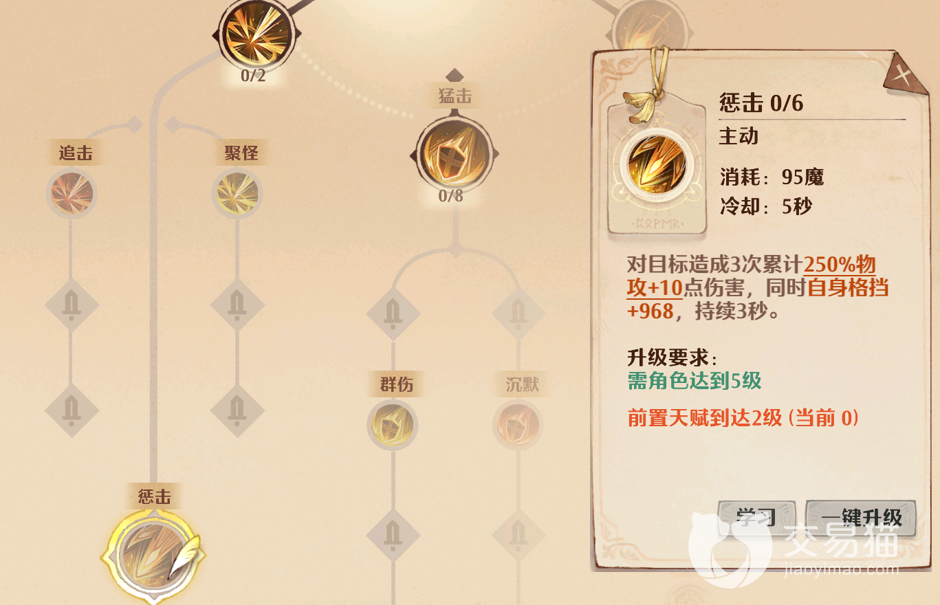 不过需要注意的是不管你点哪个分支,都只点一点即可,因为点满它们需要花费十六点,这样你前期根本没多的点数再去点亮其他技能。特别是下面的这个“惩击”一定得优先点,这个是战士坦度的根本保障,它既可以造成三次伤害,还能提供三秒的格挡加成,并且仅需六点就可加满,性价比非常高。