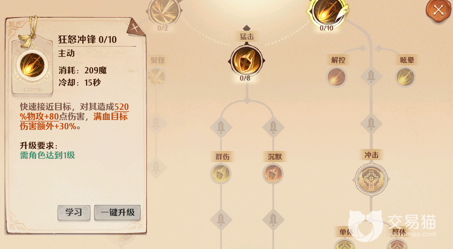 技能树右侧“狂怒冲锋”点满十级,这个技能是战士的核心技能之一,它给予了战士强劲的先手开人能力,并且本身对于满血敌人还有额外伤害,很适合给敌人一个出其不意的下马威。