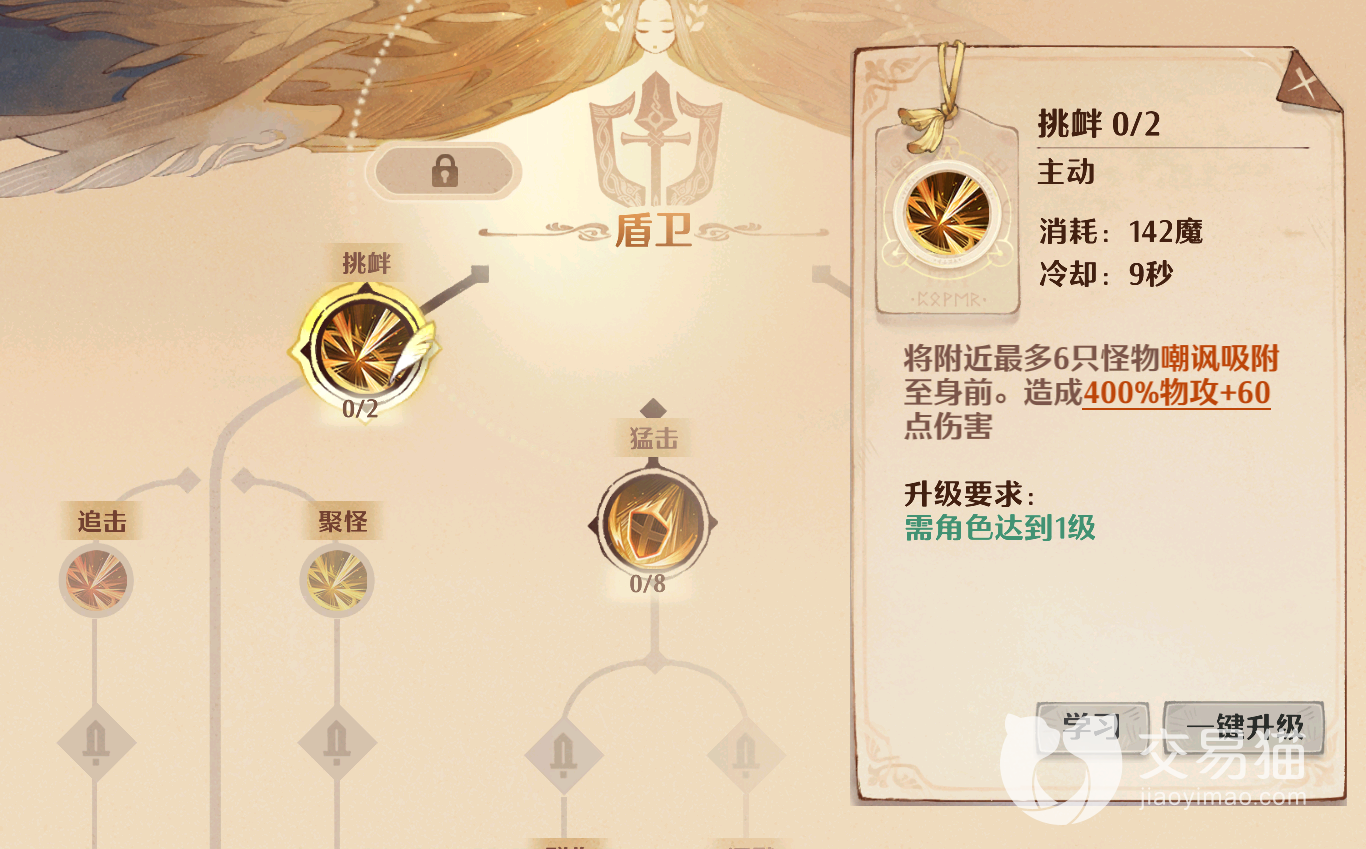 首先可以把最左边的“挑衅”给点满,因为它点满的成本很低,两点就可以完成,并且它的效果也是非常实用,能够将附近六只怪物嘲讽至身前并施加可观的物理伤害,这点无论是配合队友,还是衔接自己的后续连招,都是十分好用的。