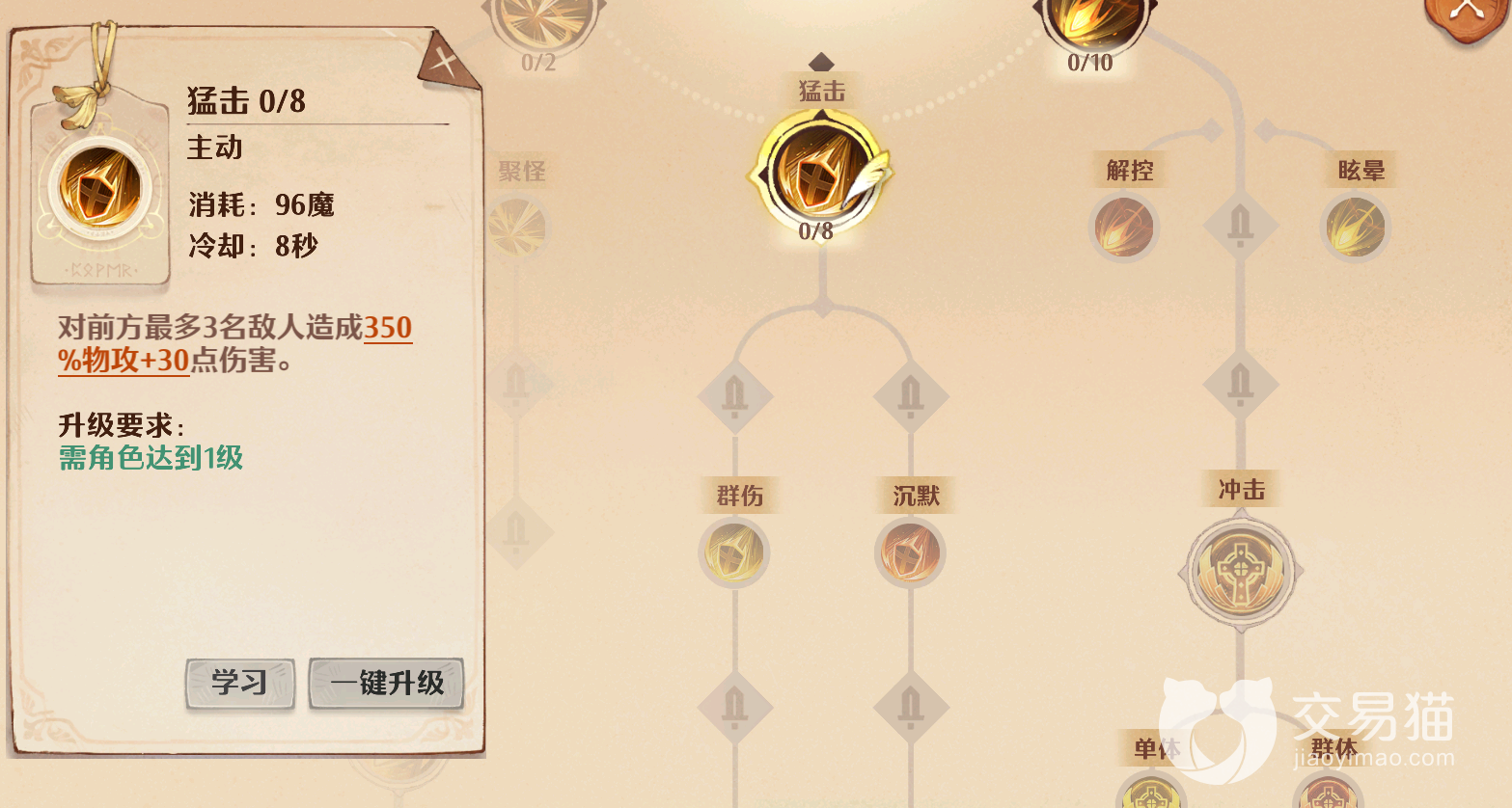 技能树左侧点完之后再来看看中间,“猛击”可以对三名敌人造成350%物攻+30的伤害,对于担任前排的战士来说算是一种AOE的补充,这个建议也直接点满,当然,这主要是为了它下面的分支,右边的分支“碎骨猛击”可以加一点,它的技能效果中含有两秒沉默,可以让敌人放不出技能,非常影响战局。另外点碎骨猛击前必须要加的那两点防御属性对于战士也是实战中用得到的基础属性。