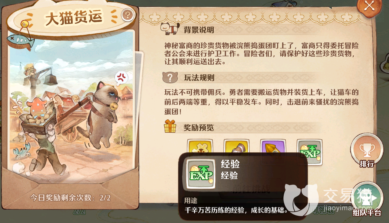 大猫货运:这个玩法每天可以参与两次,它能够稳定提供绿色类型的经验,这个类型的经验会受到每日获取上限的影响,所以一定要先去打完,另外通过该模式你还有机会获得一些诸如万灵卡牌碎片和金色装备之类的珍稀奖励!