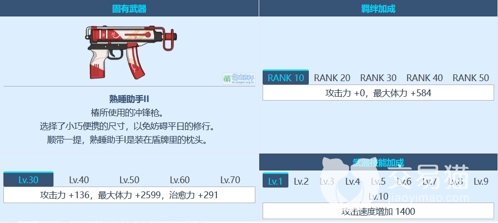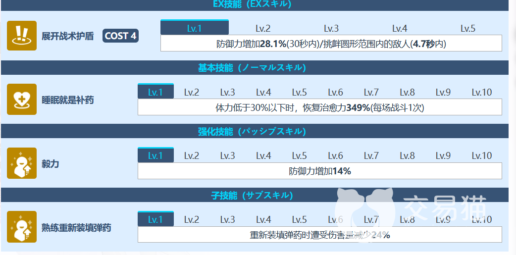 接下来就是强化技能的讲解了。他的强化技能名称为毅力,每次的话可以提升自己的防御值,高达14%(有没有很心动呢)。熟练的重新填装弹药的技能,就是在春使用冲锋枪时装填弹药可以避免一定的伤害,可降低42%左右。但是这个技能需要该角色达到三星的时候,才能够解锁哦。