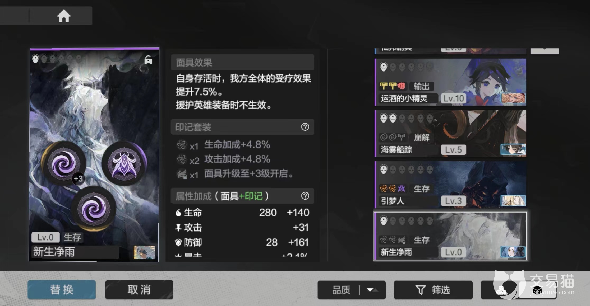 新生净雨是SR品质的面具,强度适中适合治疗辅助类型英雄,在面具图表上标的就是生存类型,可以提高队伍的存货,特殊效果是面具携带者存货时,我方全体英雄受到的治疗效果得到提升,使用相同的面具淬炼后还可以提升治疗效果的数值哦。